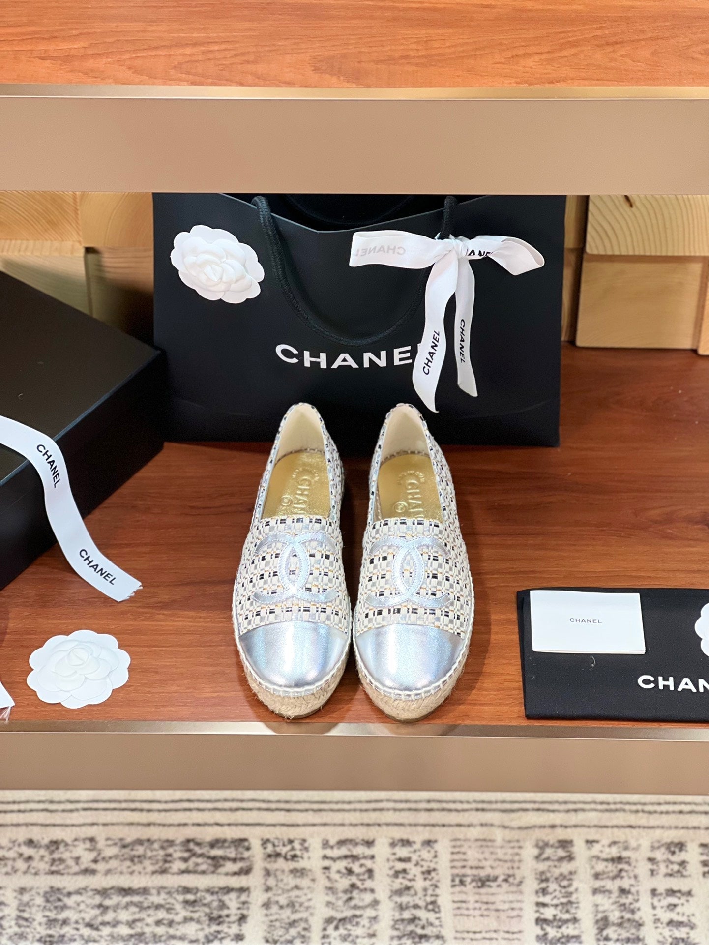 cc espadrilles beige black woolen cloth silver metalic lambskin