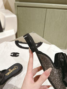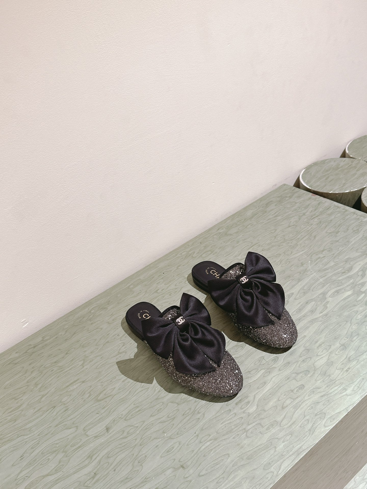 CC JEWELED MULE WITH SILK BOW AND BLACK LAMBSKIN