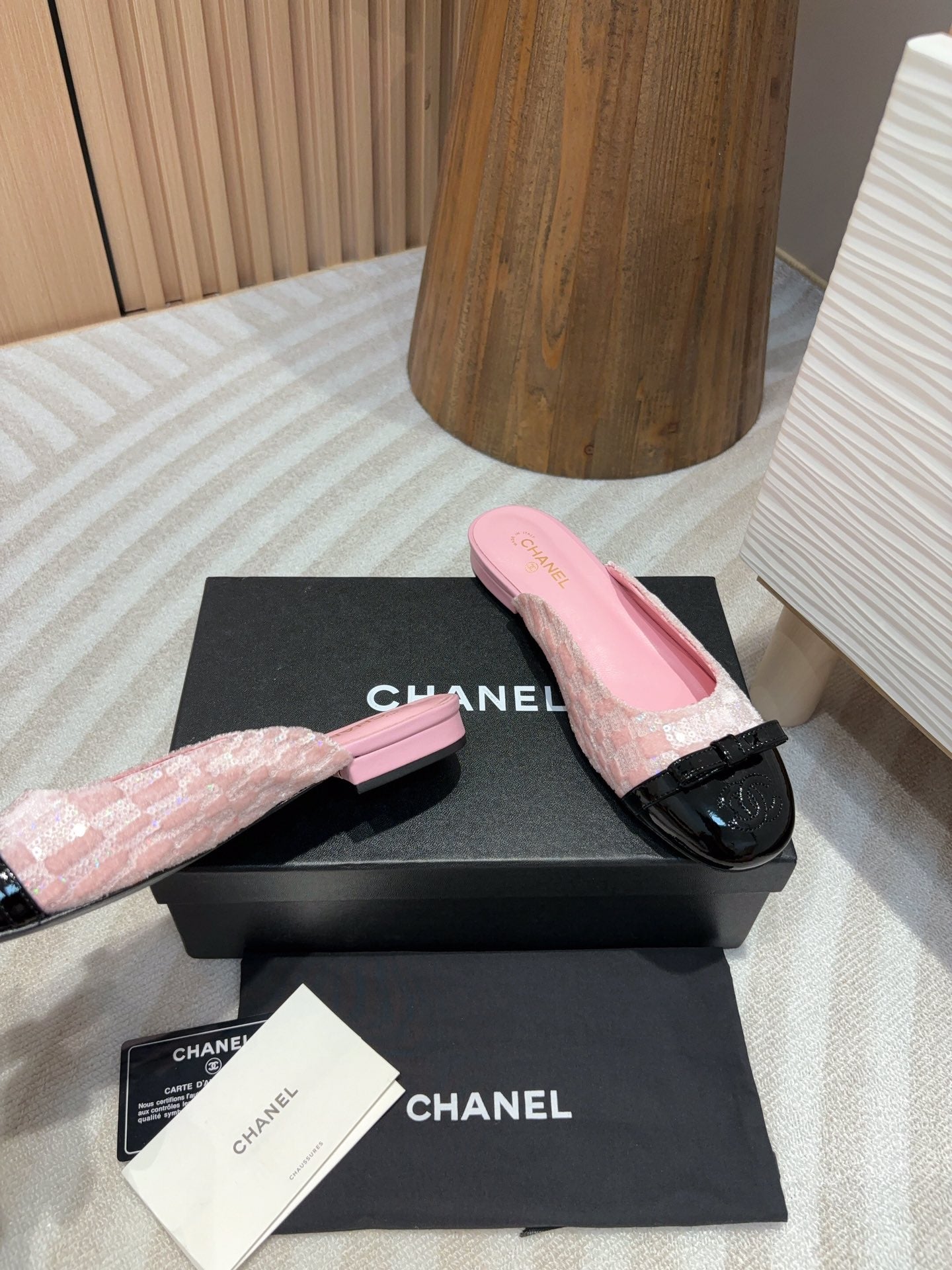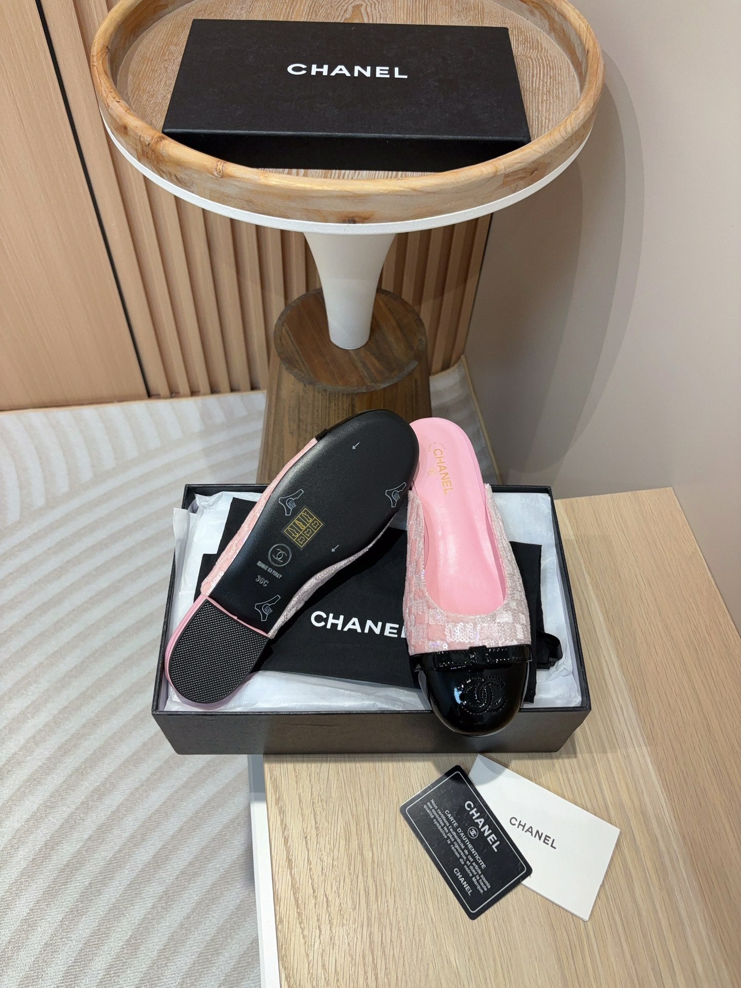 cc mule pink tweed sequin black patent calfskin