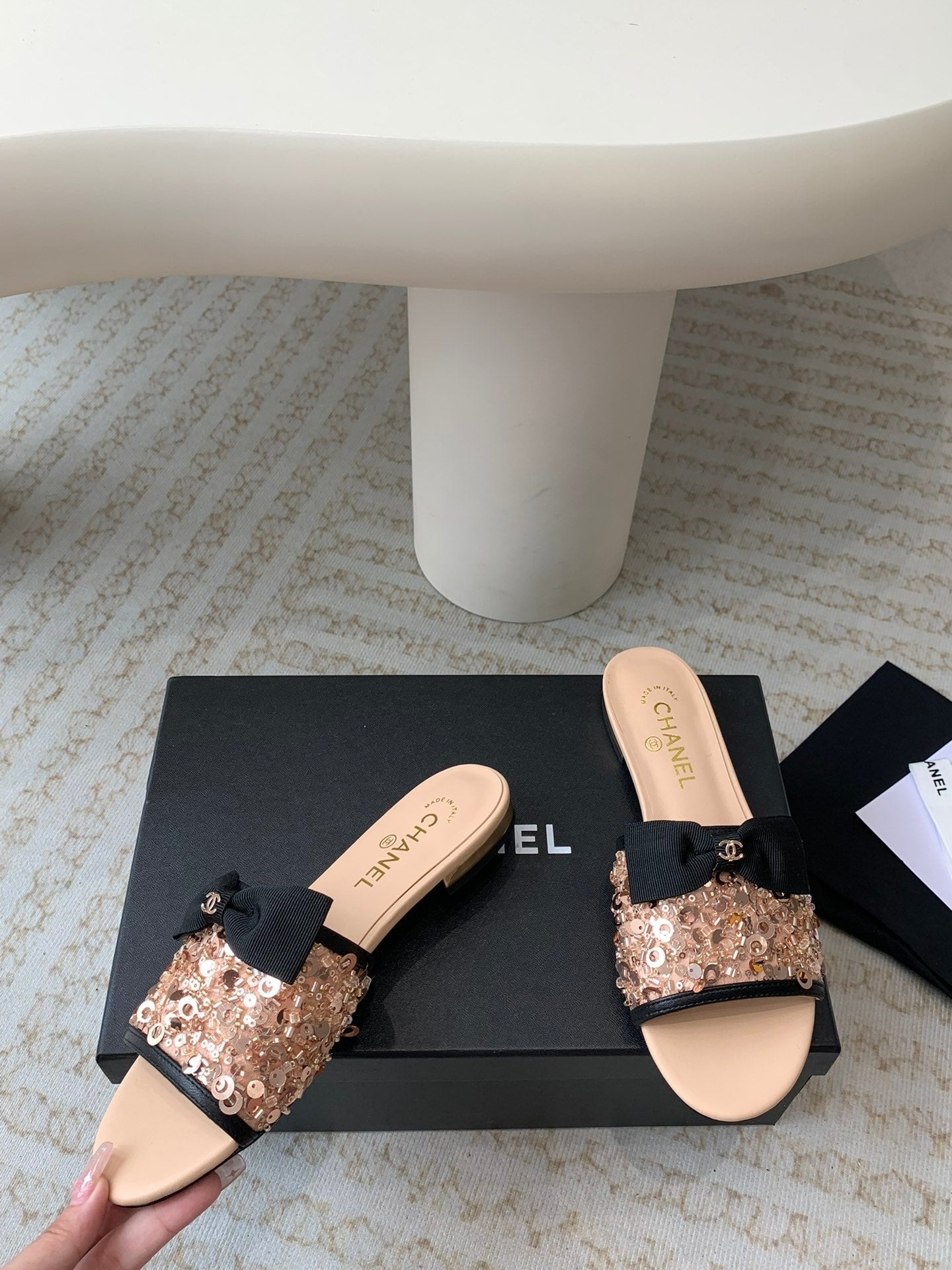 mule sandal beige calfskin glitter sequin