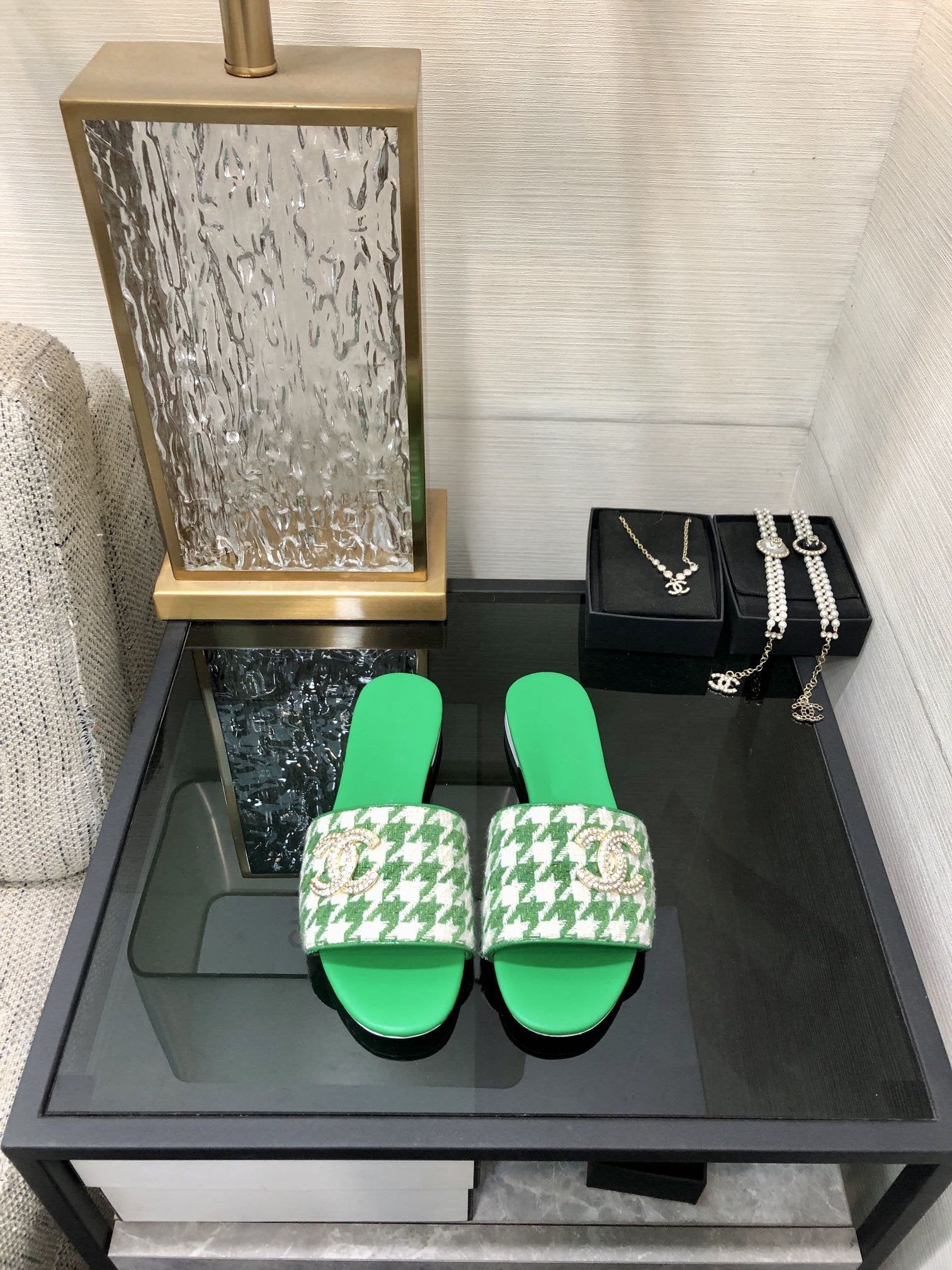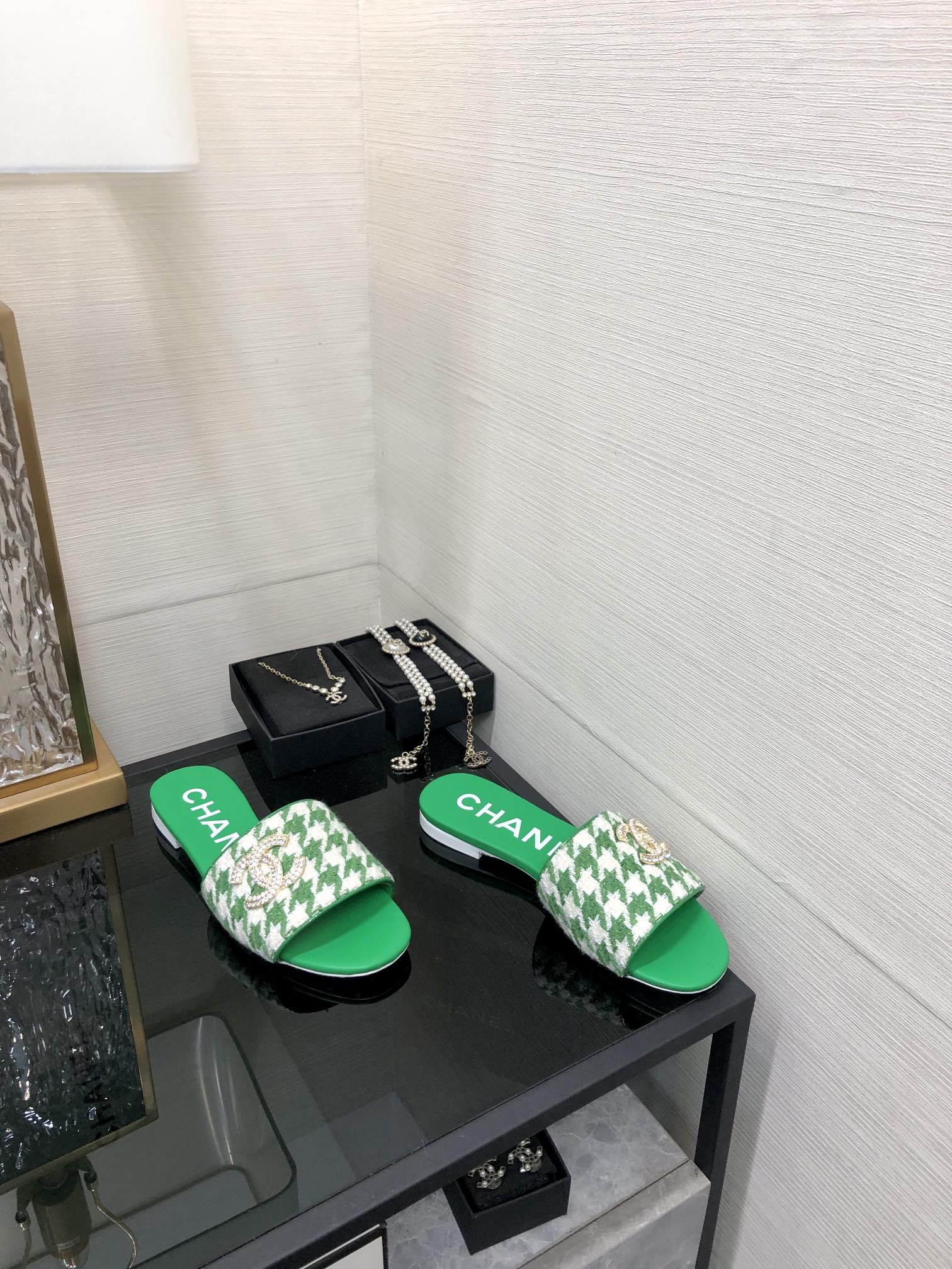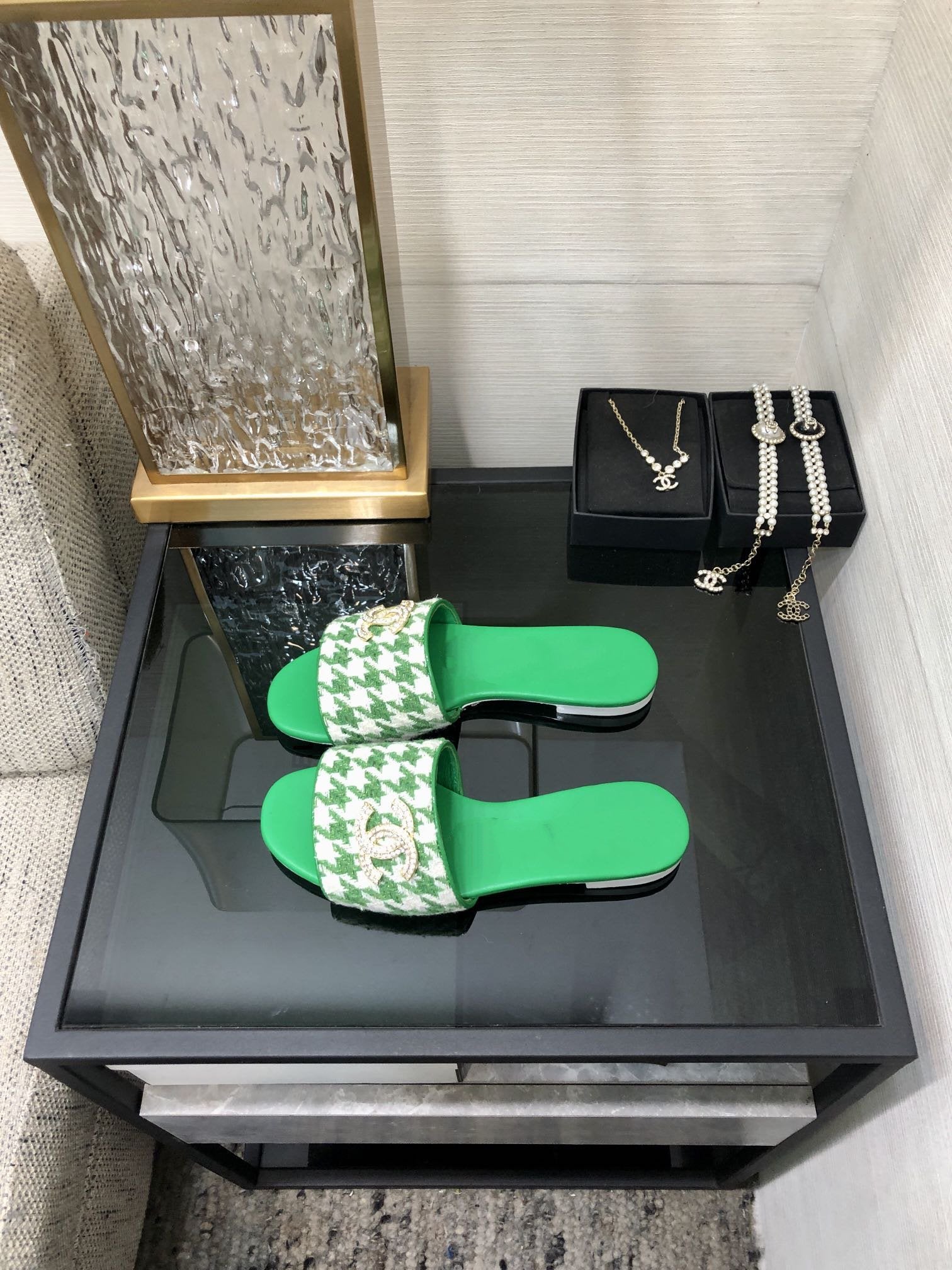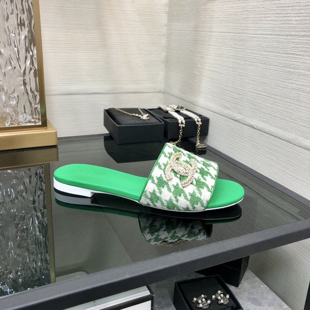 mule sandal green white houndstooth fabric