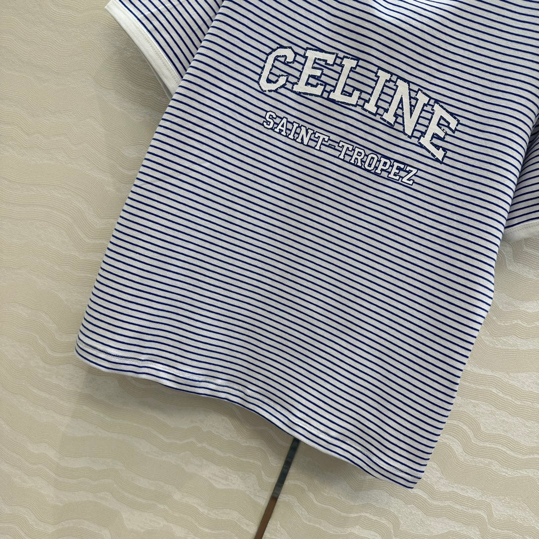 Celine 25 Striped Letter Short-sleeved T-shirt Blue White Cotton