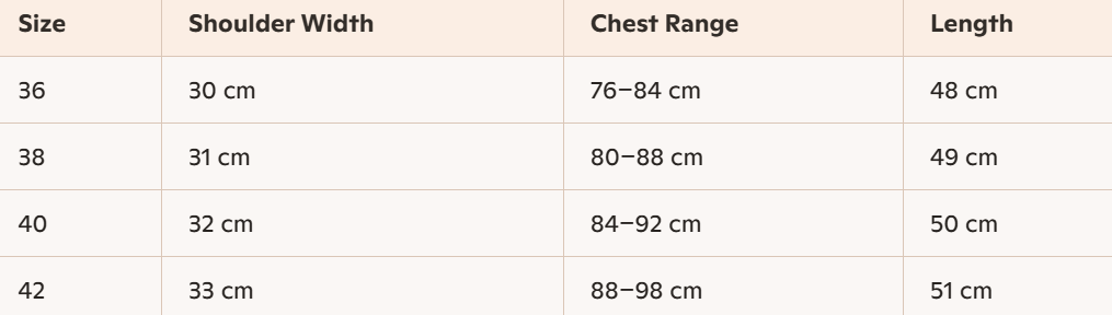 - Size : 36, 38, 40, 42