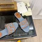 FENDI BAGUETTE SIGNATURE SLIDE IN LIGHT BLUE DENIM AND BROWN CALFSKIN