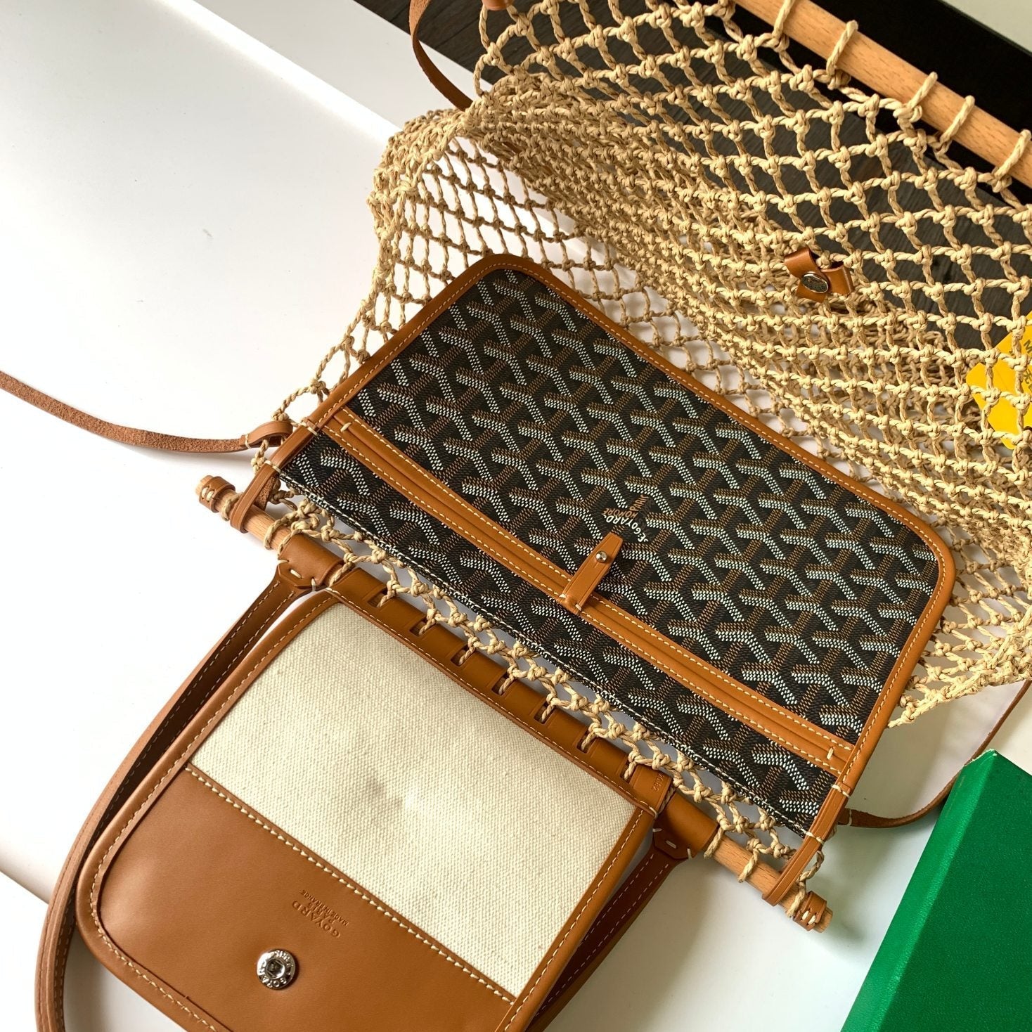 • Material: Woven raffia and calfskin