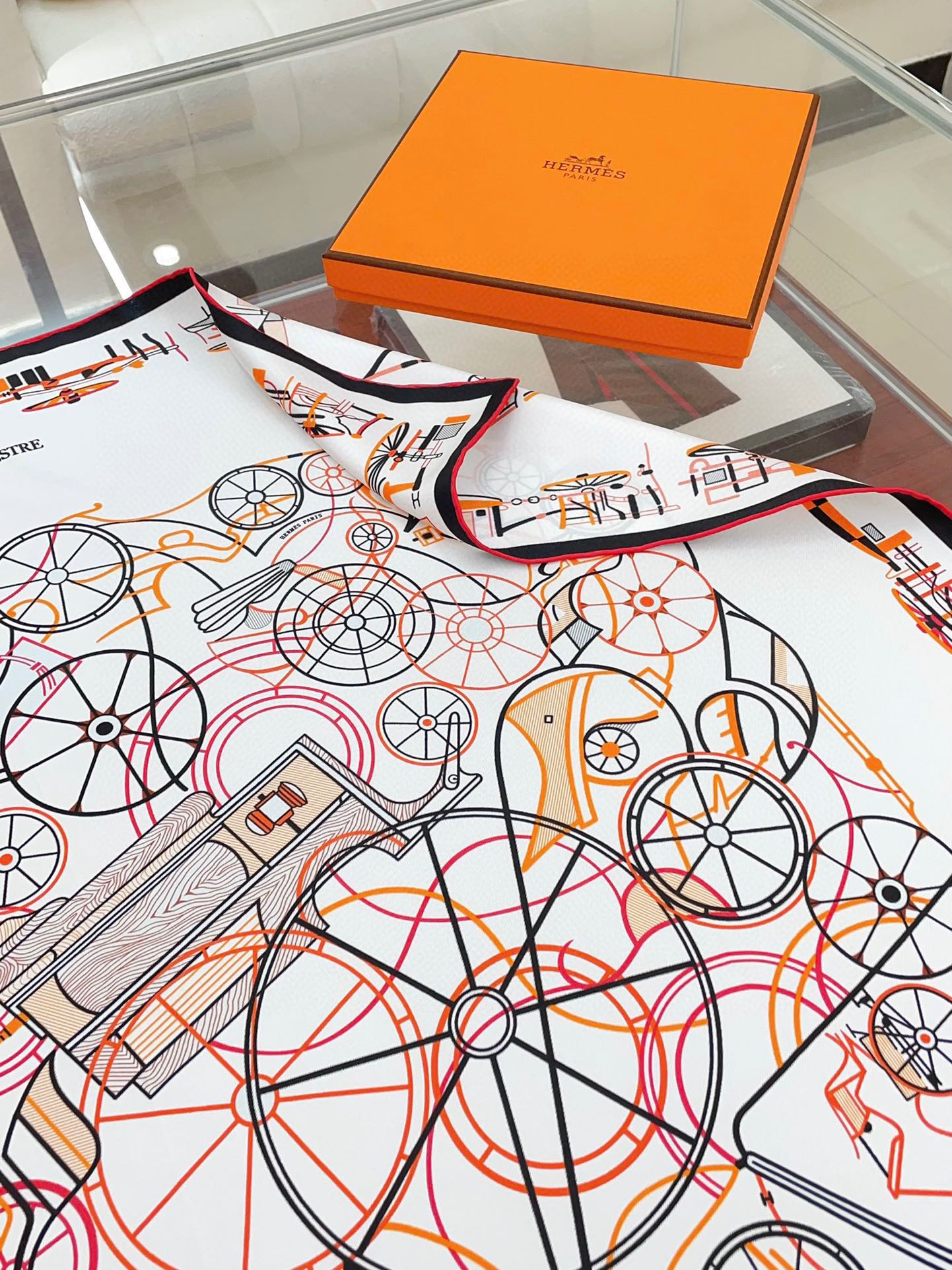 Complication Equestre Scarf 90 CM In White Orange Coloful Silk Twill 345897