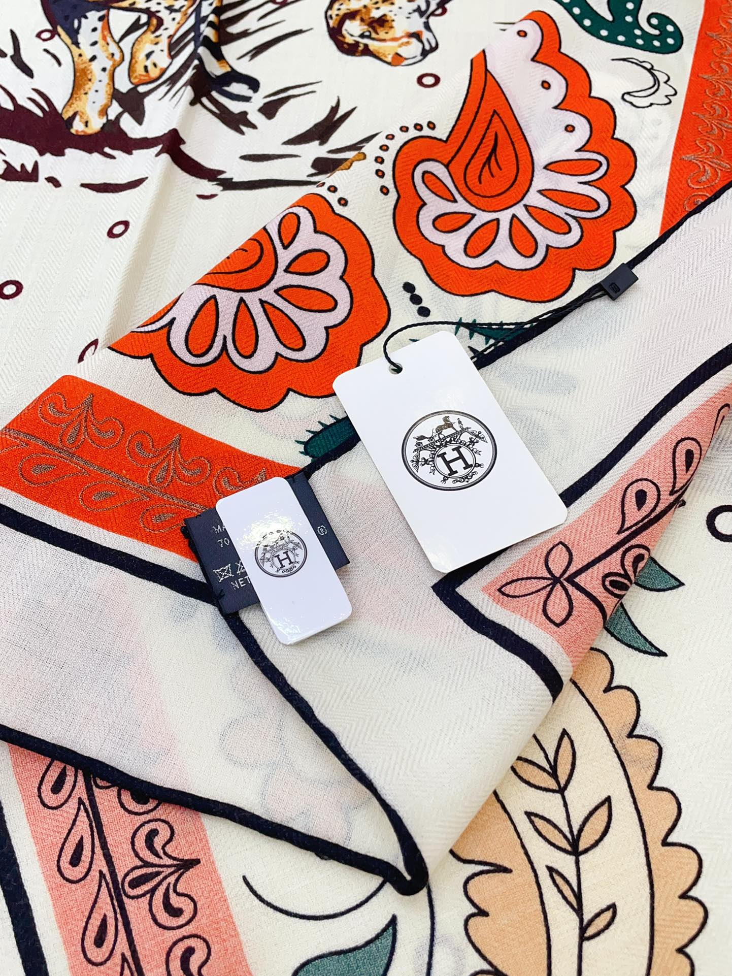 Guepards Bandana Double Face Scarf 140 CM In White Mix Red Colorful Cashmere And Silk 334190