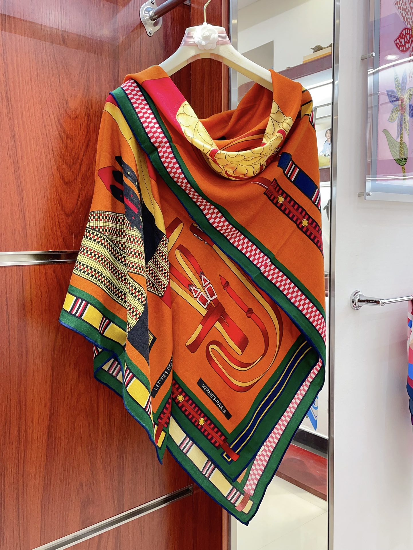 HM Lettres Equestre Scarf 140 CM In Orange Green Colorful Cashmere And Silk 359398