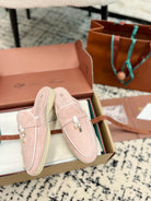 Loro Piana Light Pink White Suede Charms Walk Flat Mules