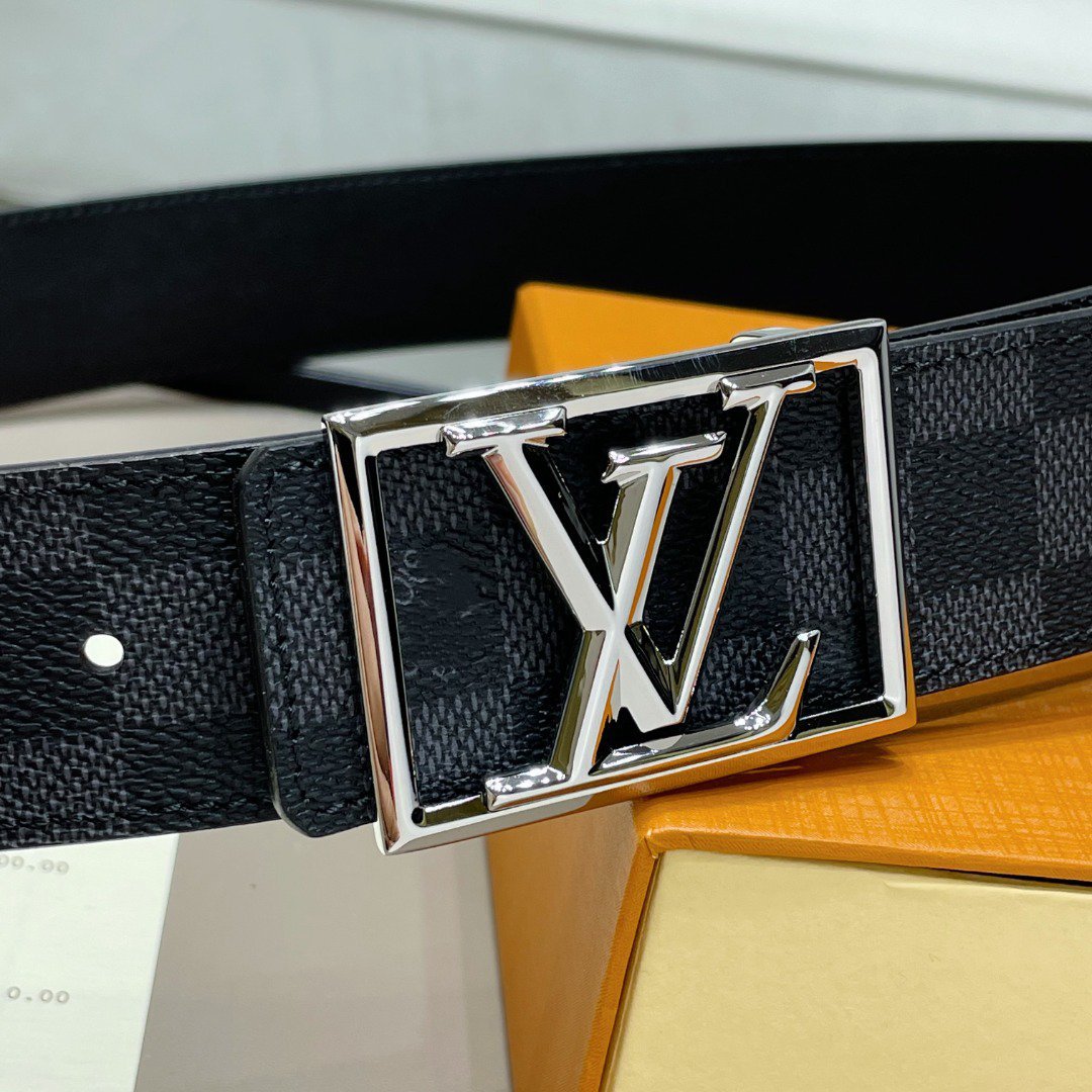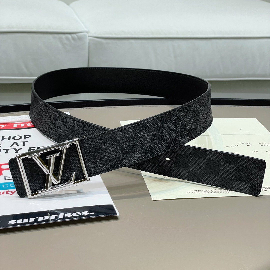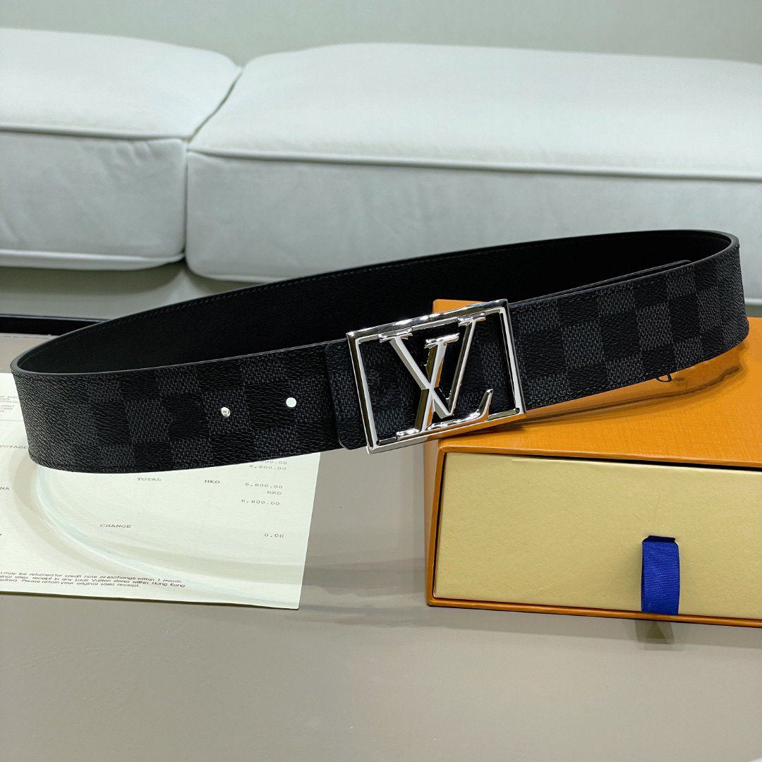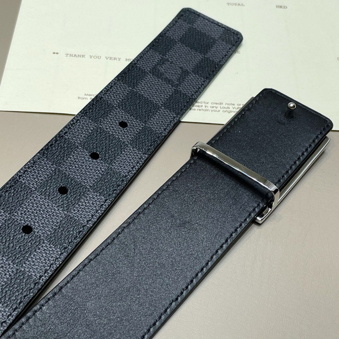 LV BELT SILVER BORDER BUCKLE BLACK GREY LEATHER 40MM