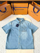 LV 25 Denim Pocket Embroidered Short Sleeve Shirt Blue Cotton