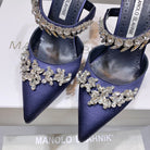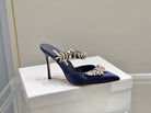 Manolo Mules Crystal Navy Blue Silk Satin 219378