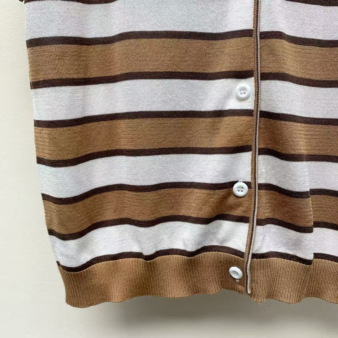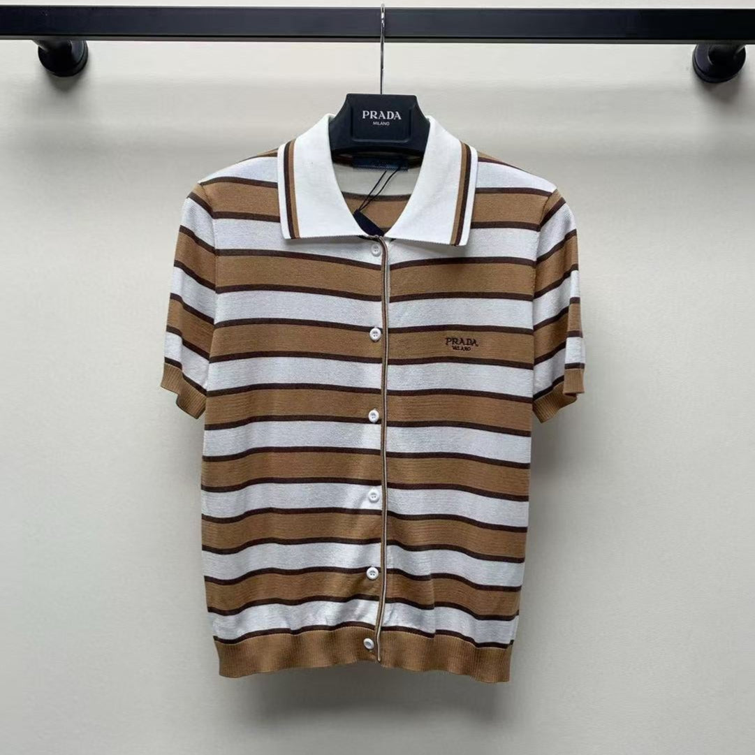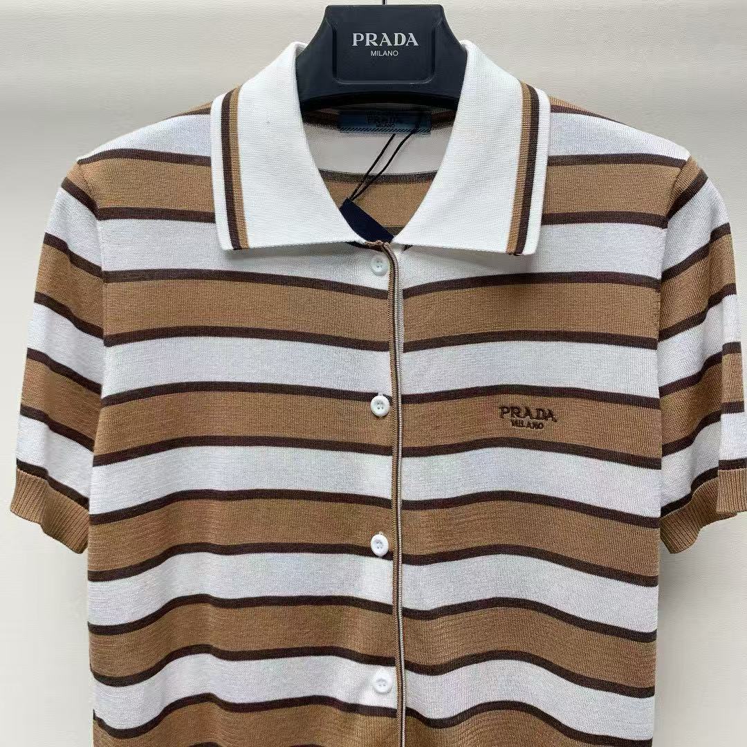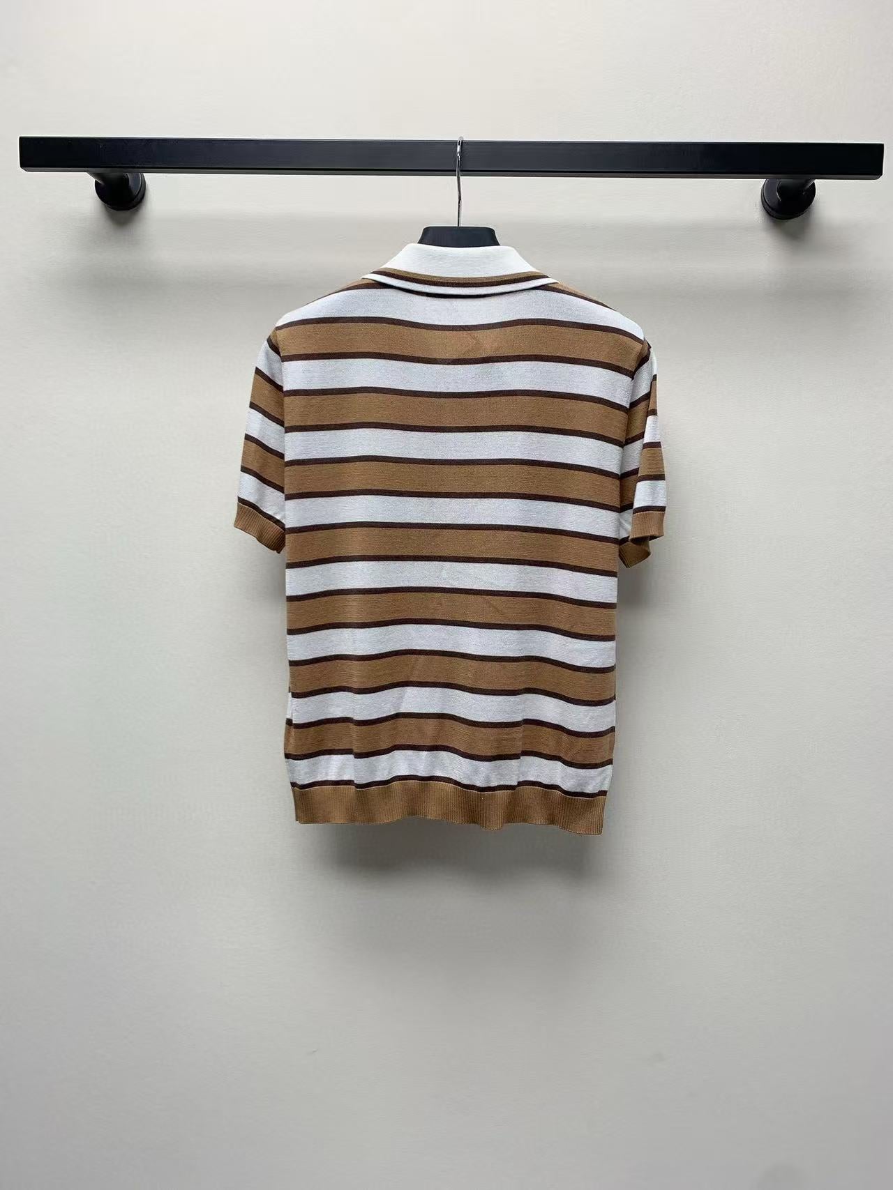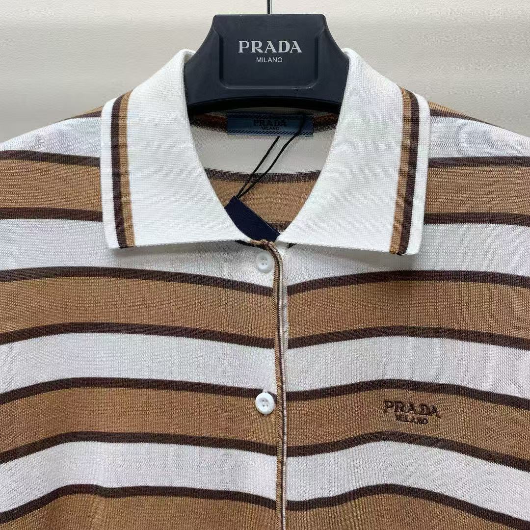 Prada Striped Polo T-shirt White Brown Tencel Cotton