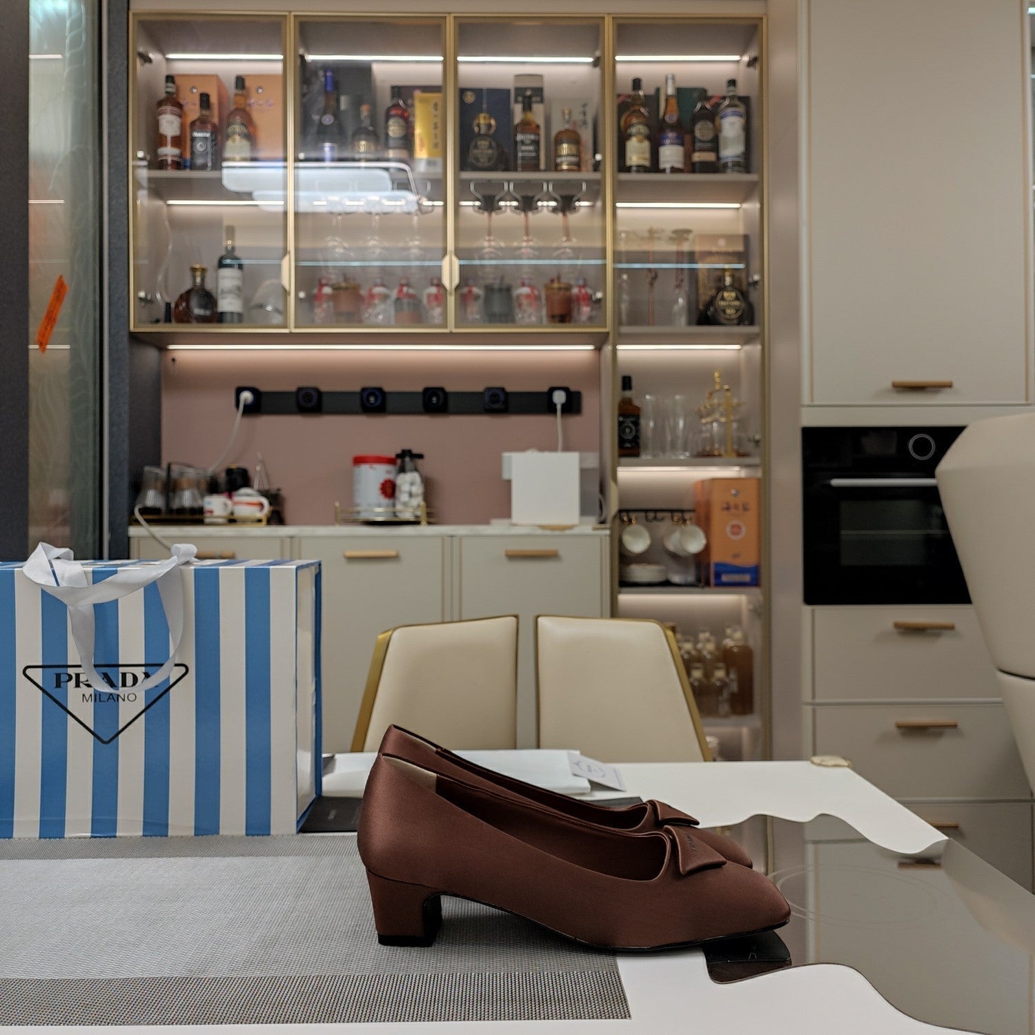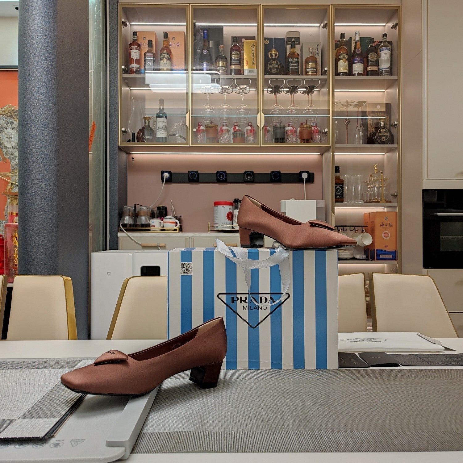 TRIANGLE LOGO PUMPS IN CHESTNUT BROWN SATIN