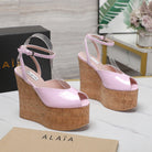 ALAIA WEDGE SANDAL IN ROSE PINK GLOSSY CALFSKIN AND BEIGE RUBBER