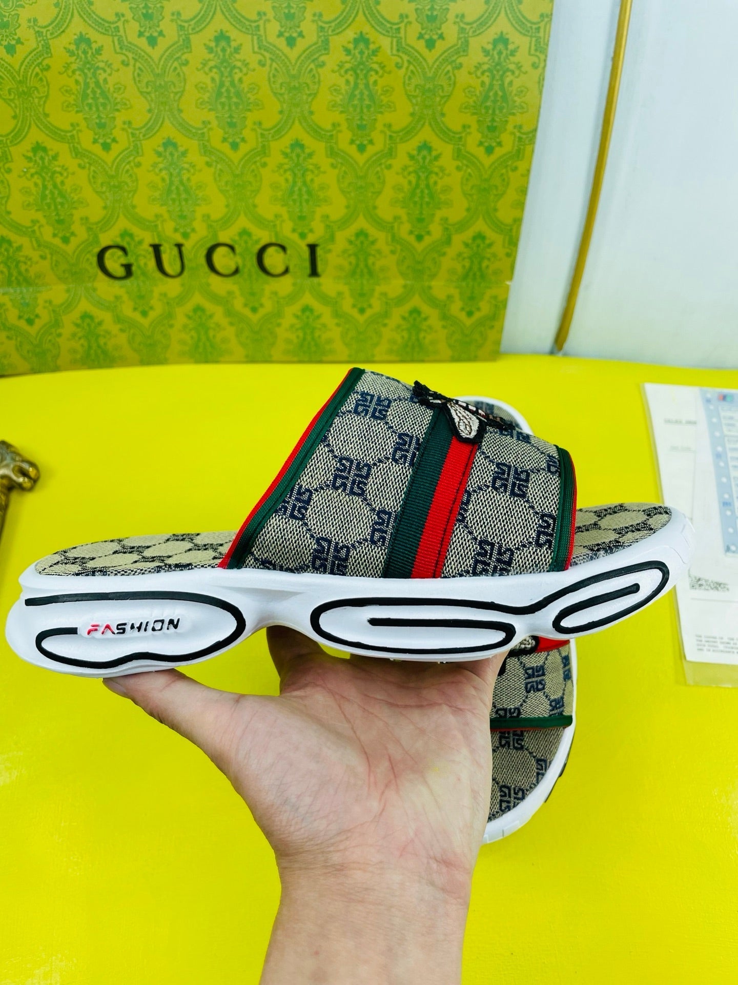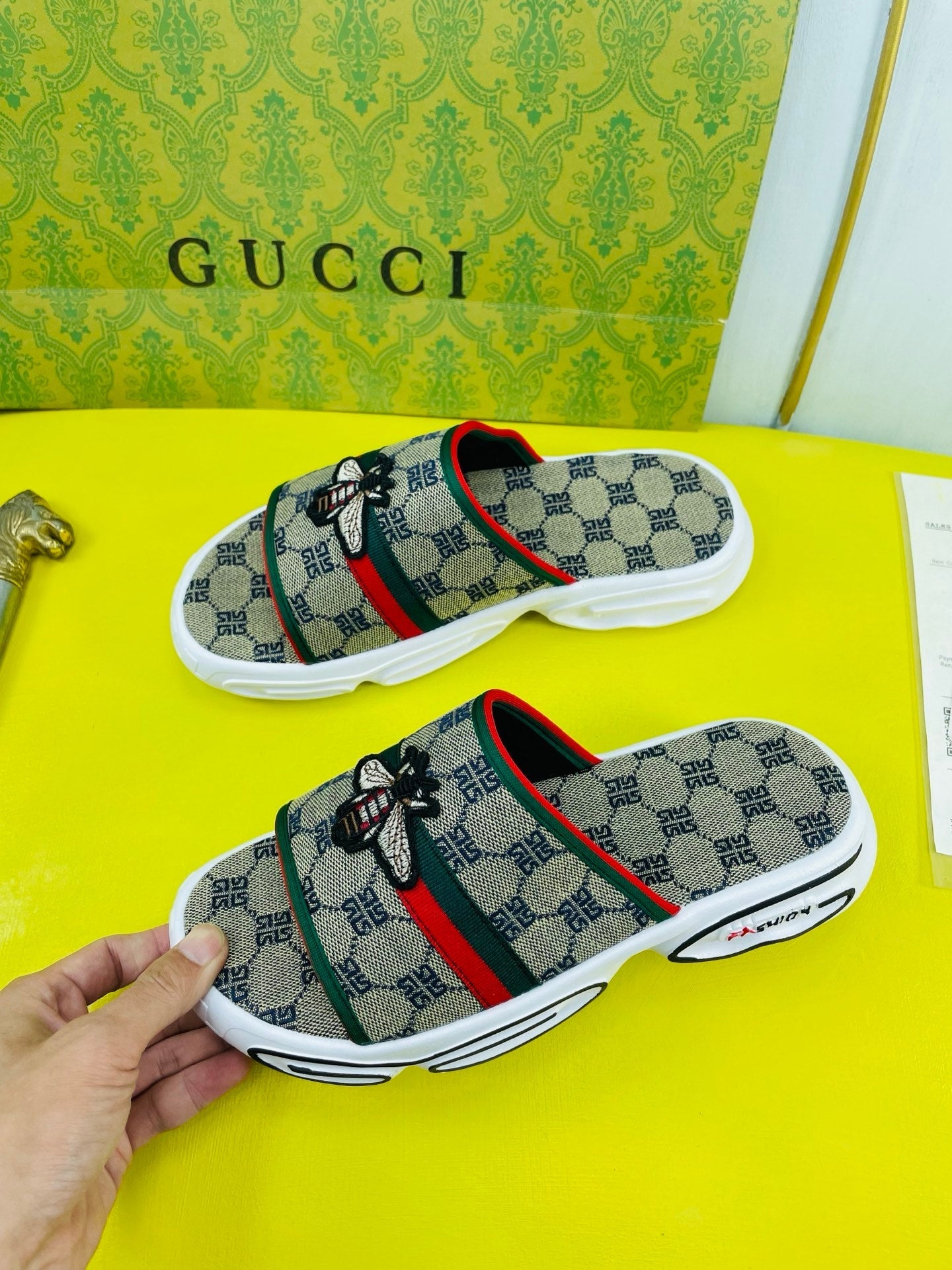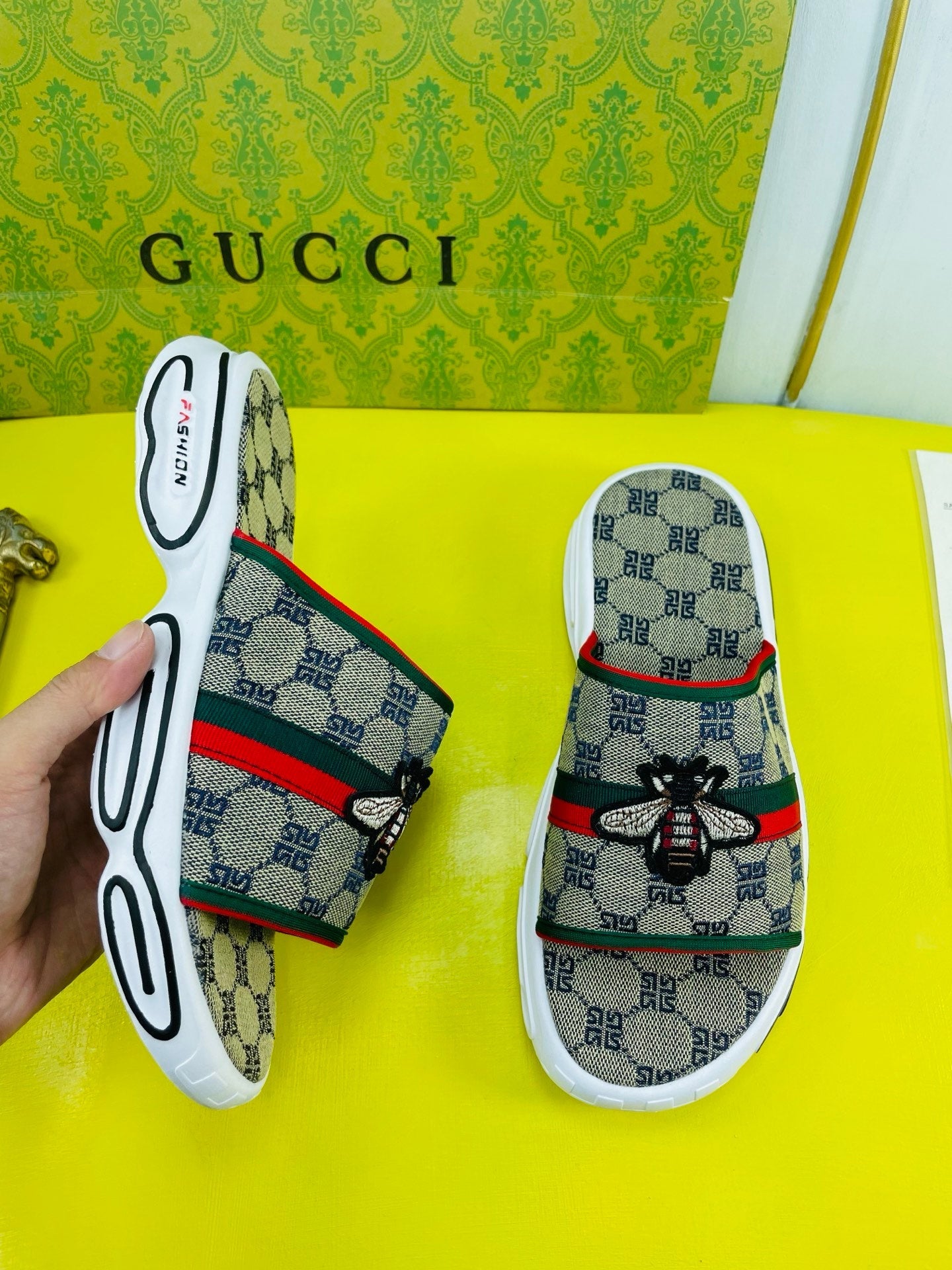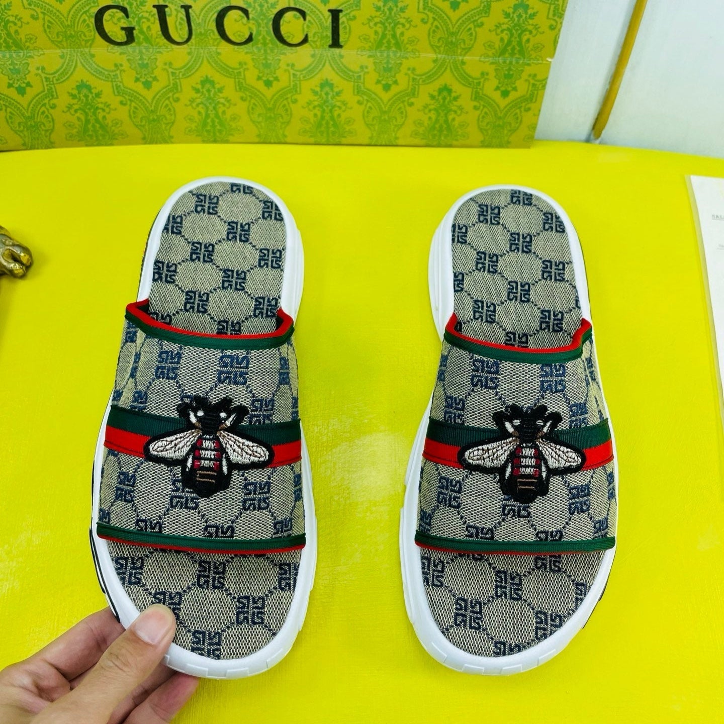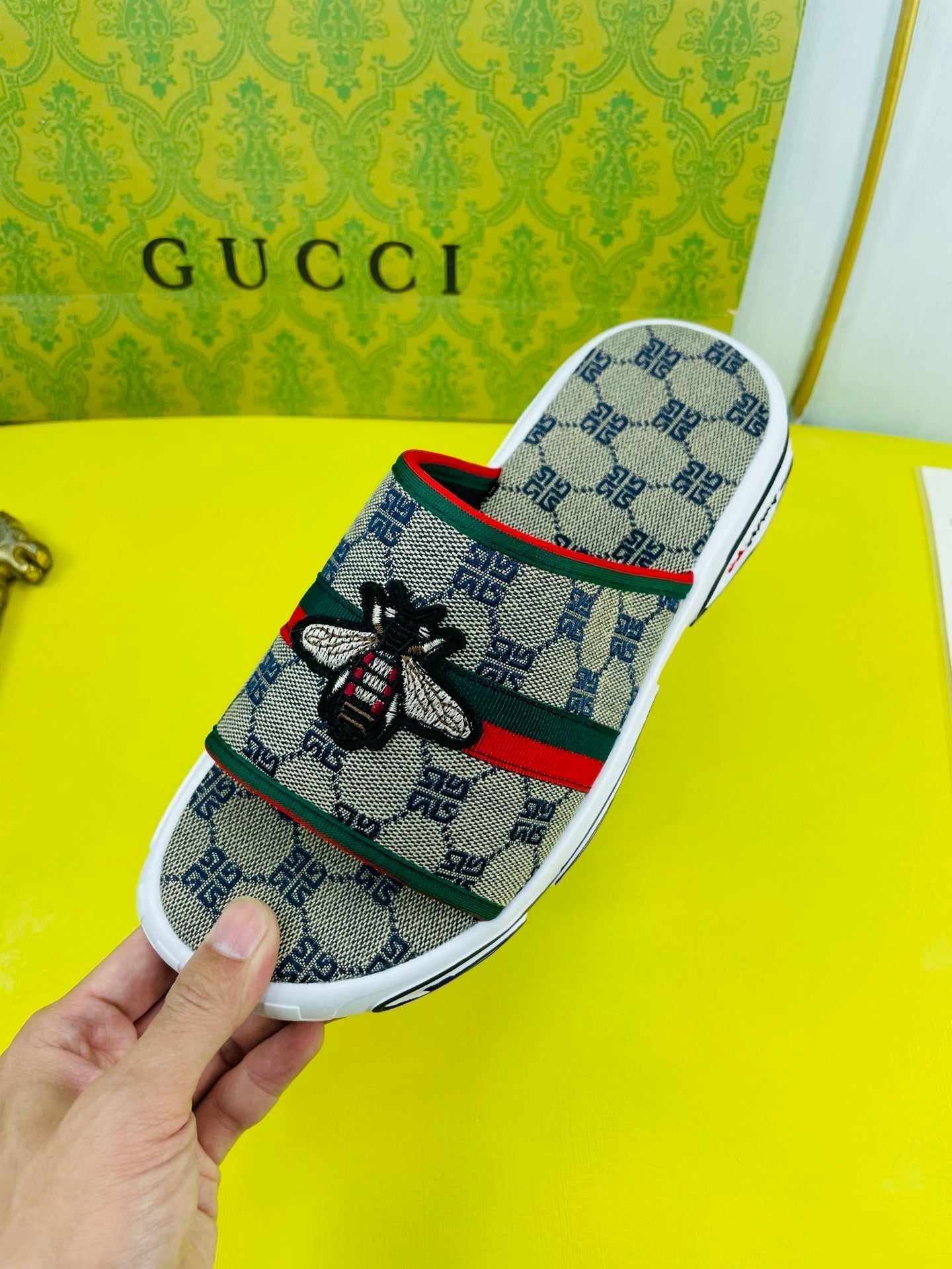 GG Men's Bee Slide Brown Gingham Fabric 538693