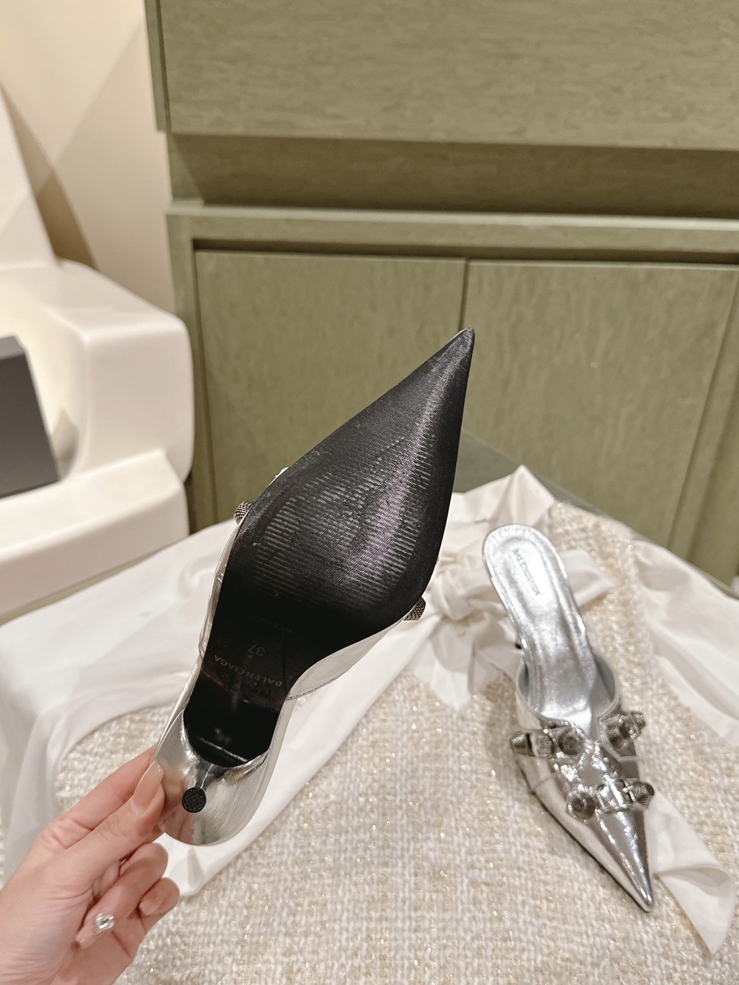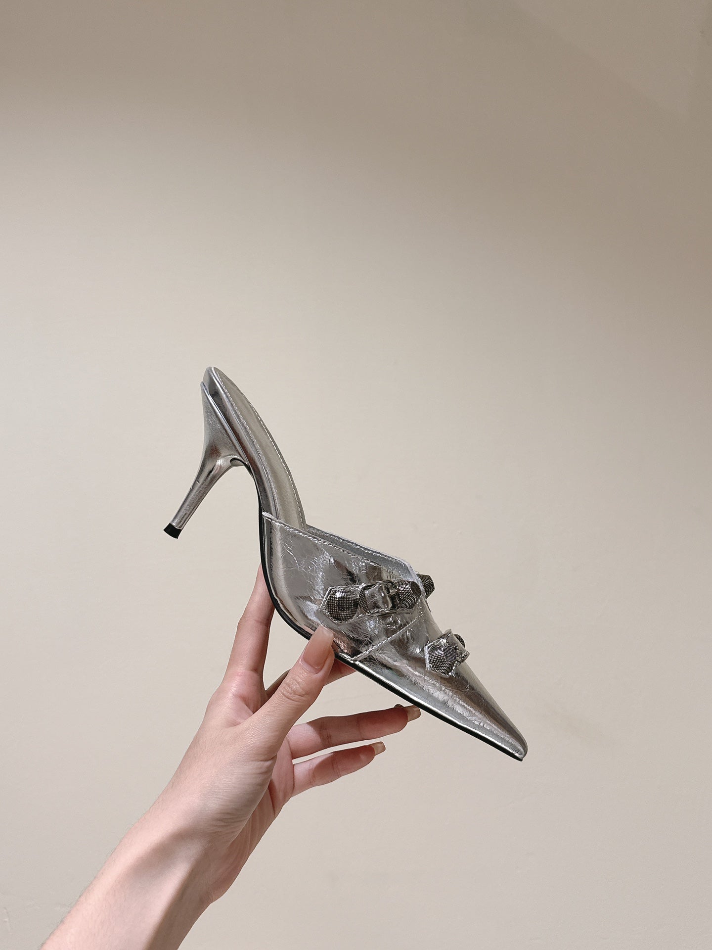 CAGOLE POINTED HIGH MULES IN SILVER SHINY CALFSKIN