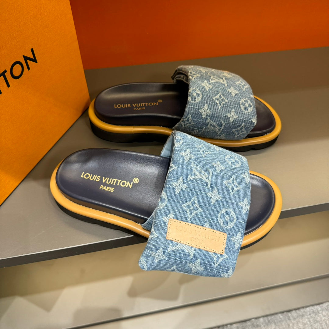 LV VELCRO SLIPPERS IN LIGHT BLUE MONOGRAM DENIM