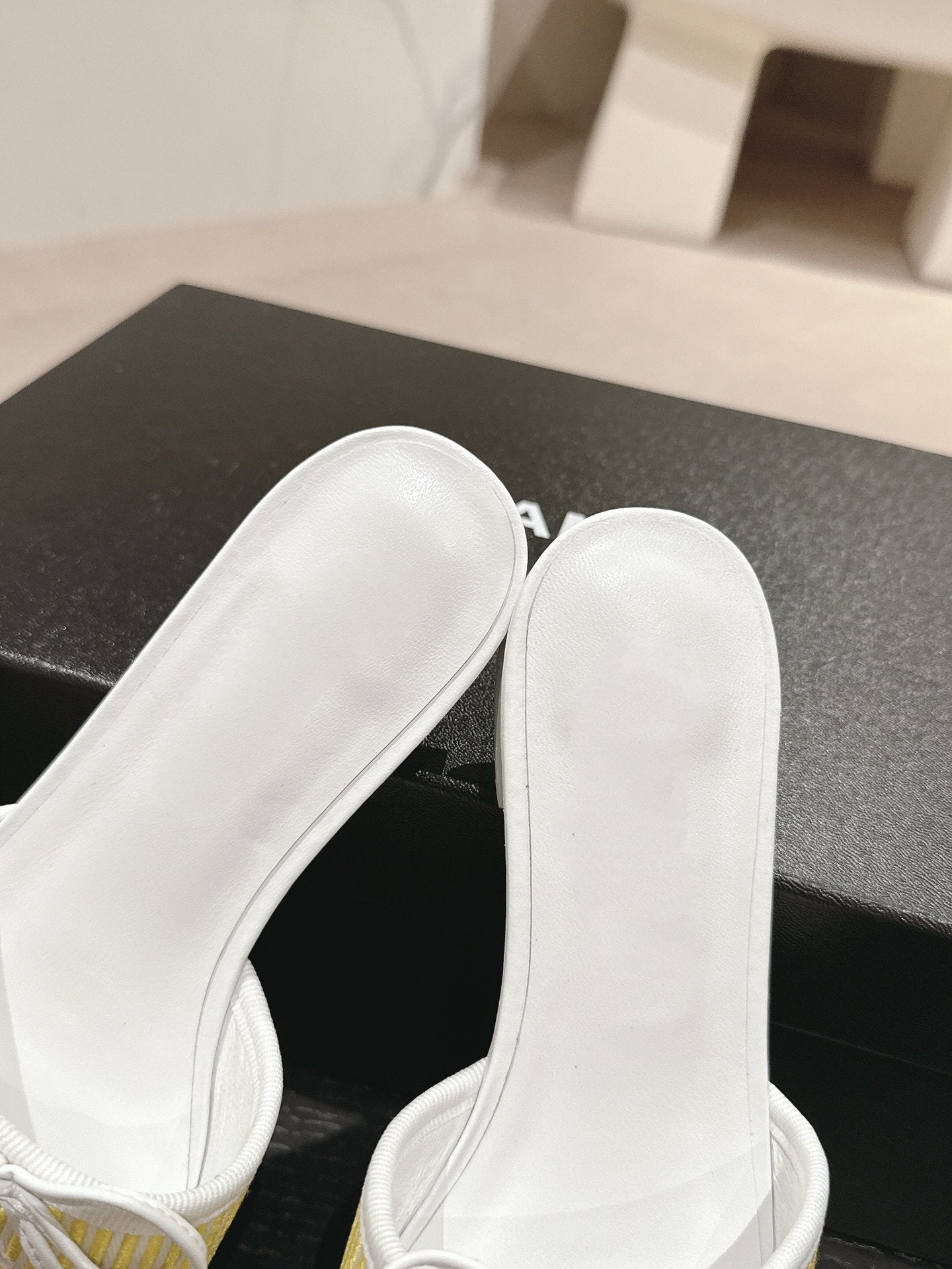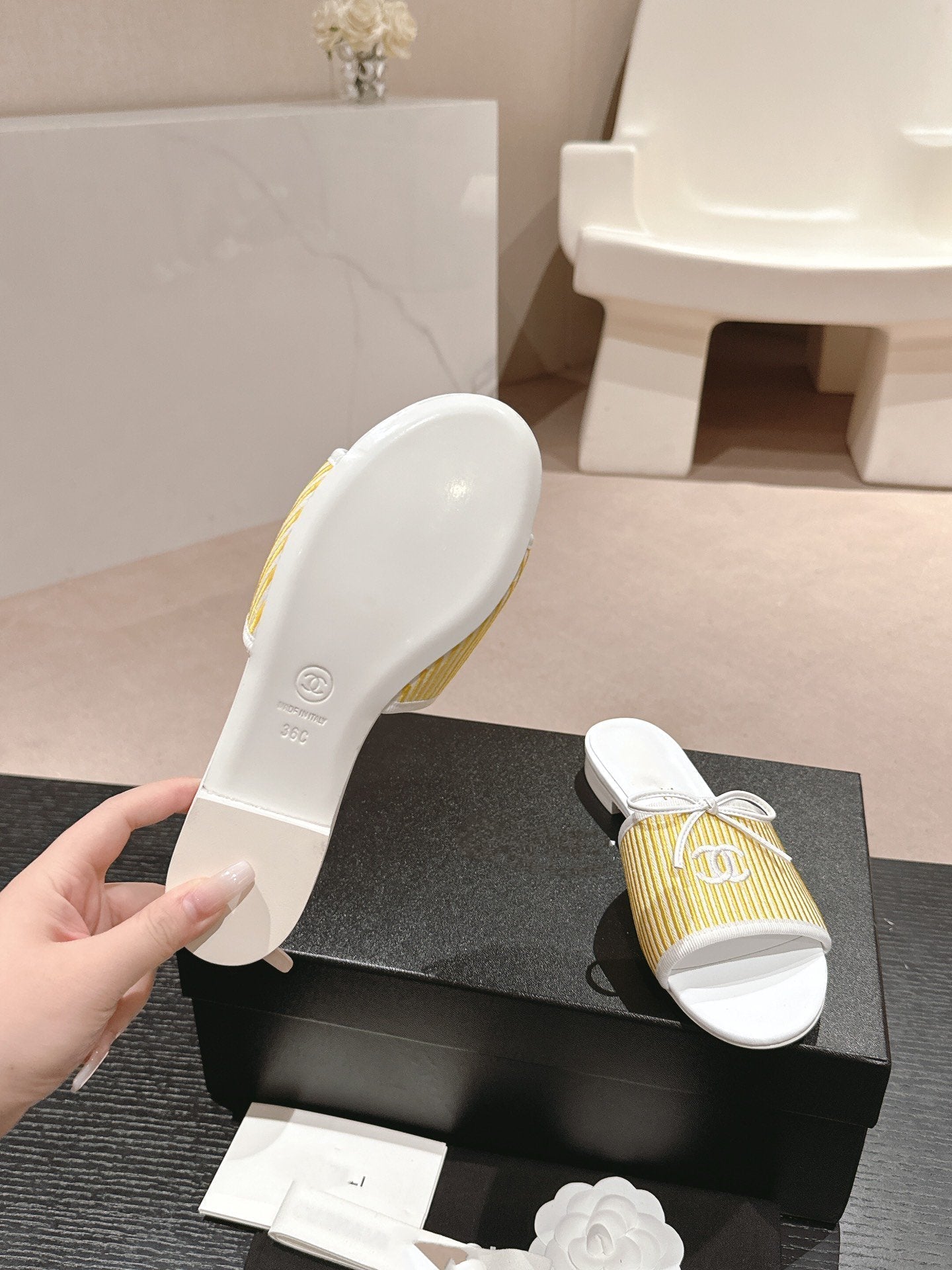 mule sandal striped yellow white canvas calfskin