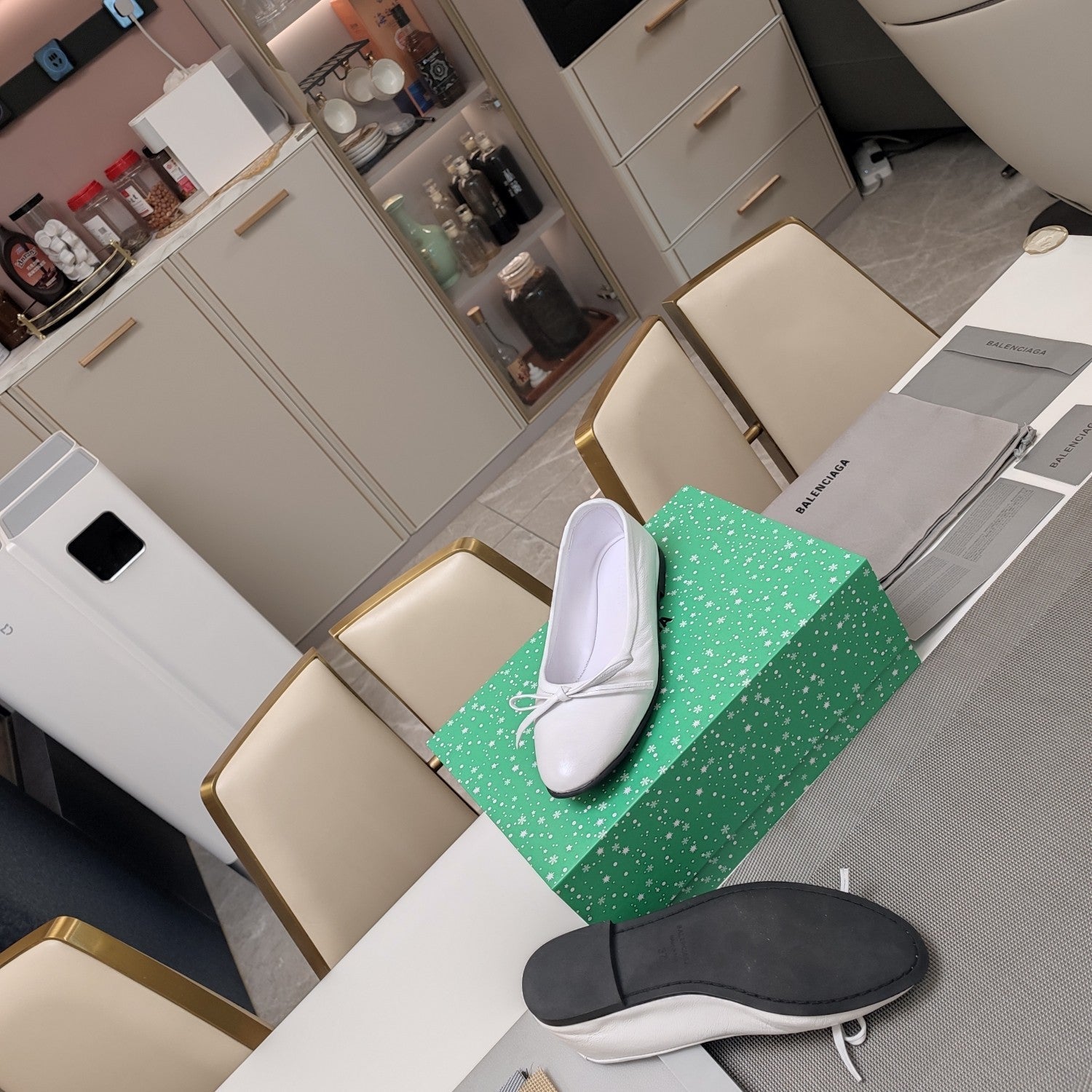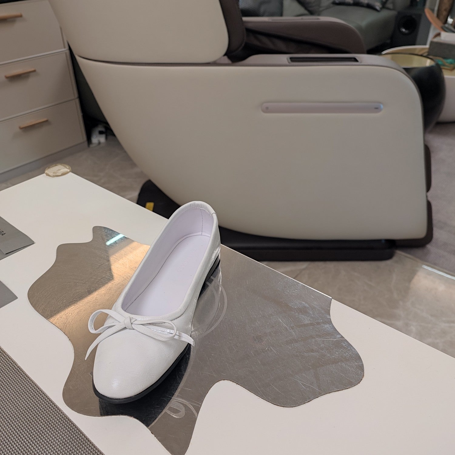 RHINESTONE BALLET FLATS WITH BOW IN WHITE WAX-OIL SHEEPSKIN