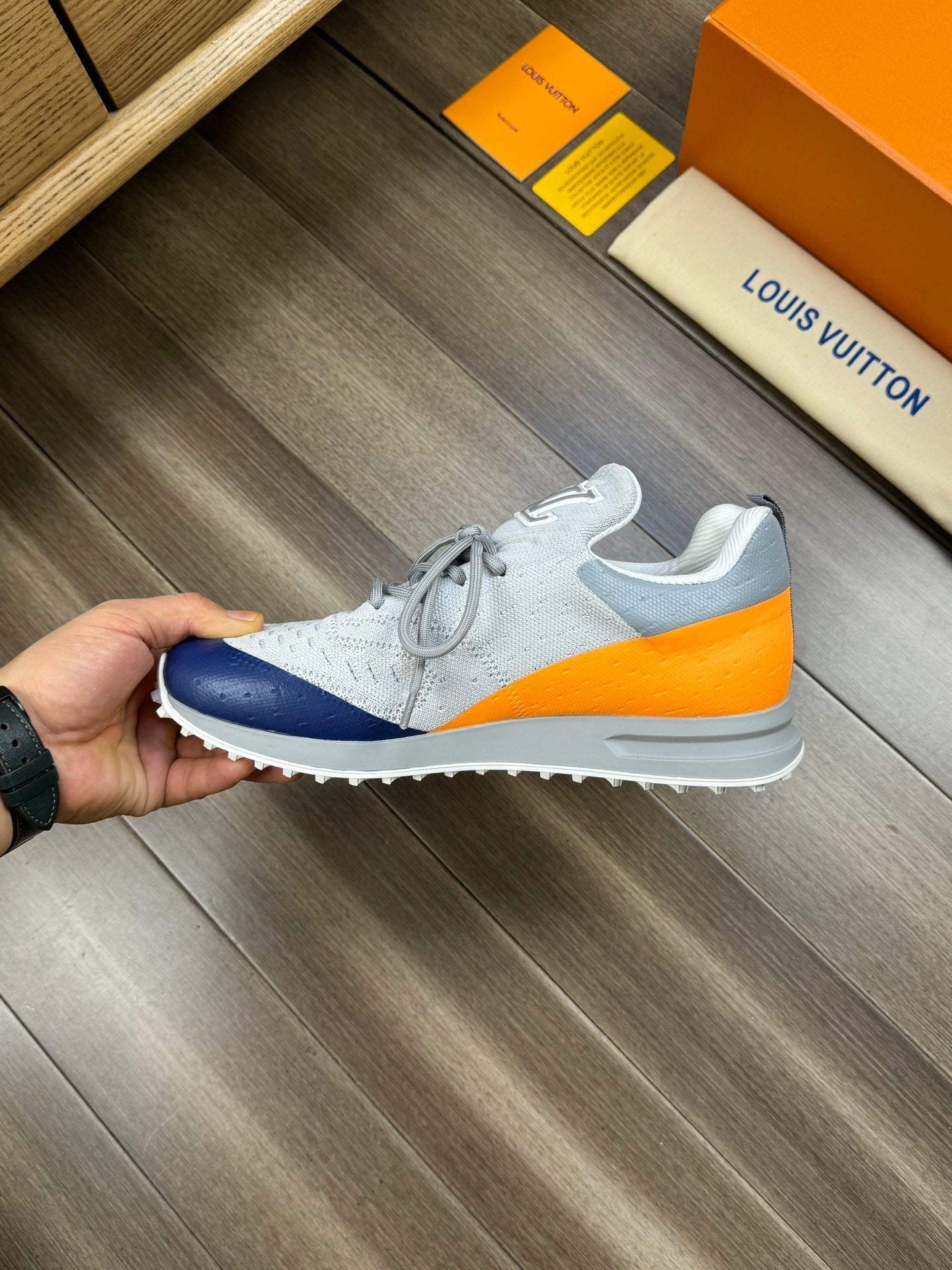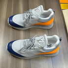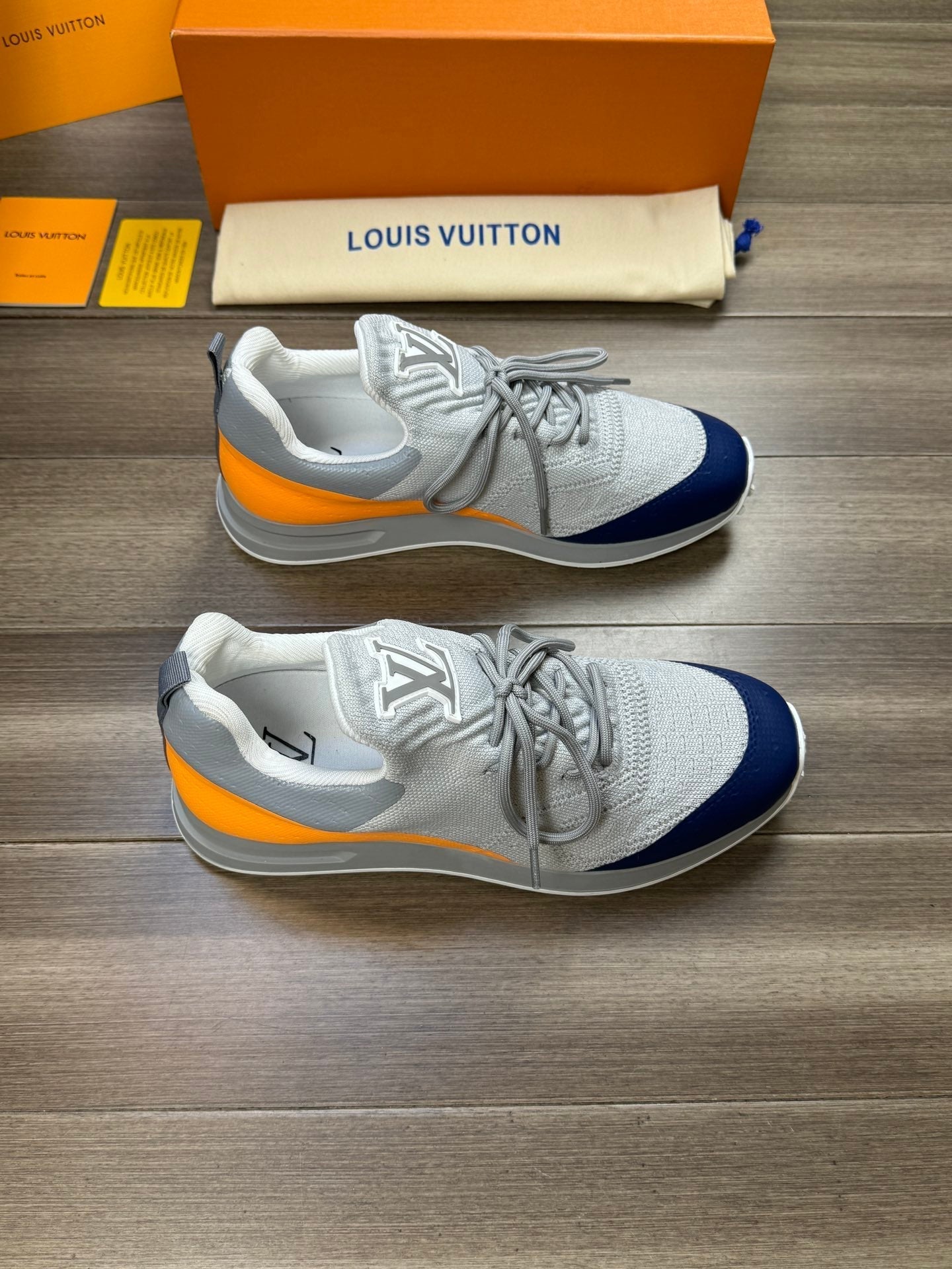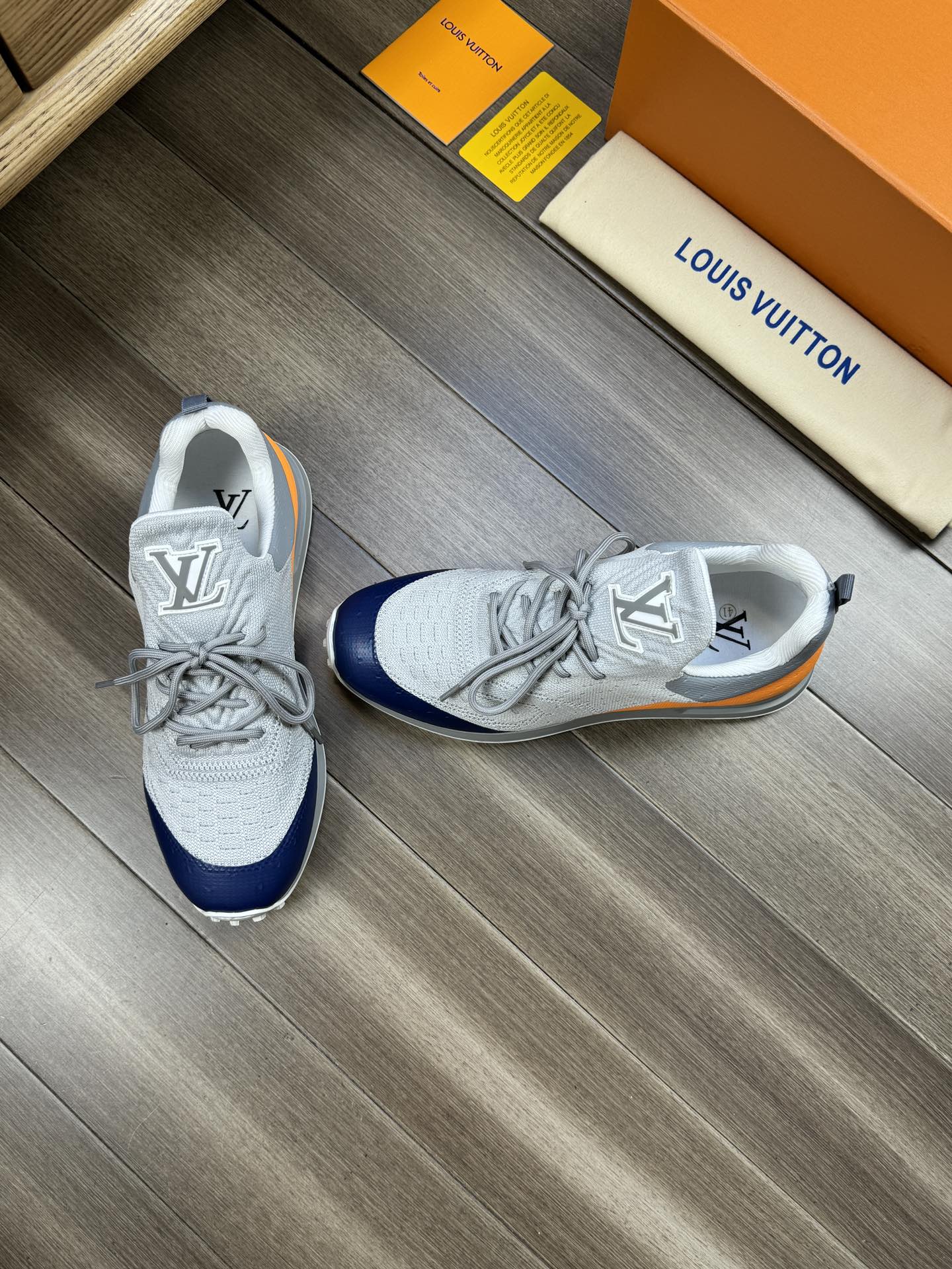 SNEAKERS IN GREY MESH BREATHABLE FABRIC AND BLUE MIX ORANGE CALFSKIN