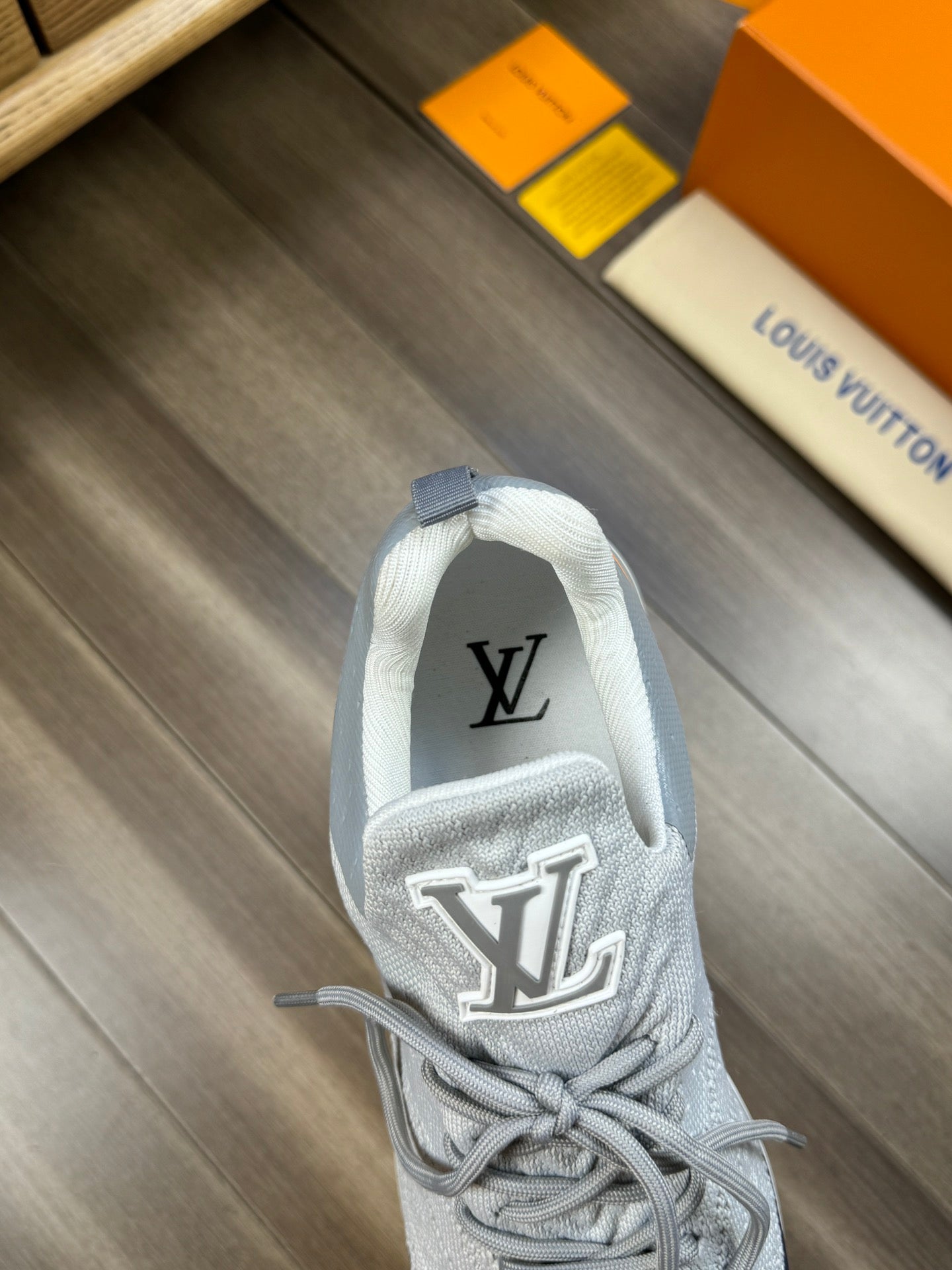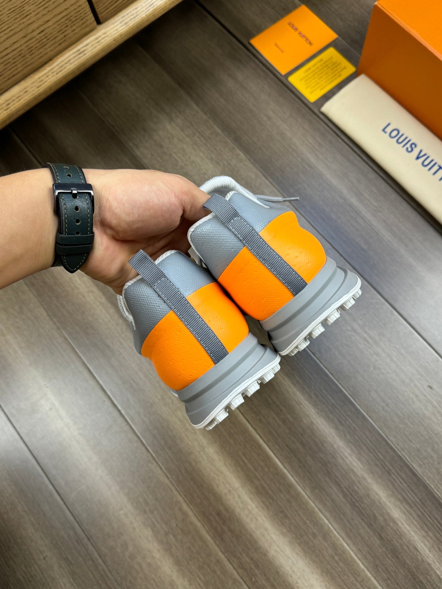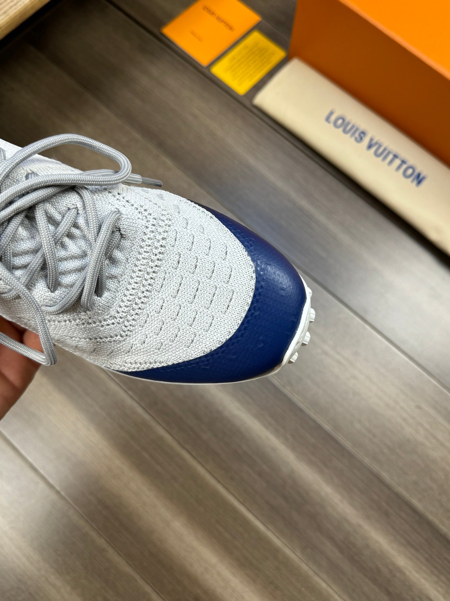 SNEAKERS IN GREY MESH BREATHABLE FABRIC AND BLUE MIX ORANGE CALFSKIN