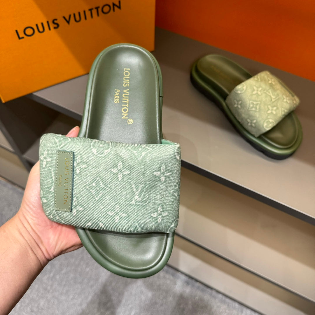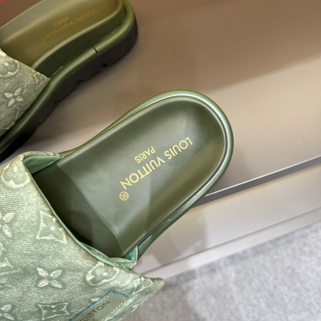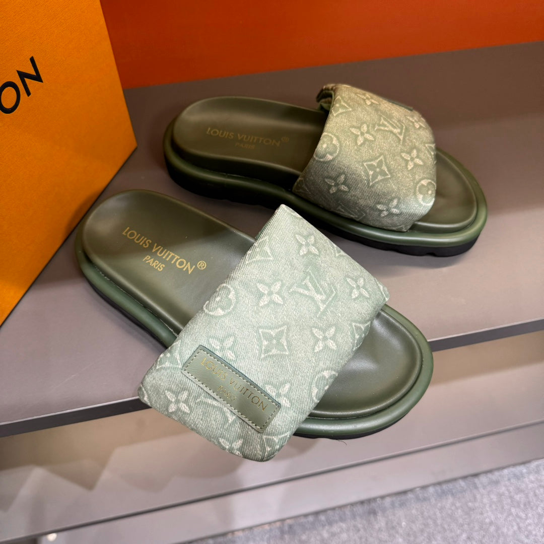 LV VELCRO SLIPPERS IN OLIVE GREEN MONOGRAM JACQUARD