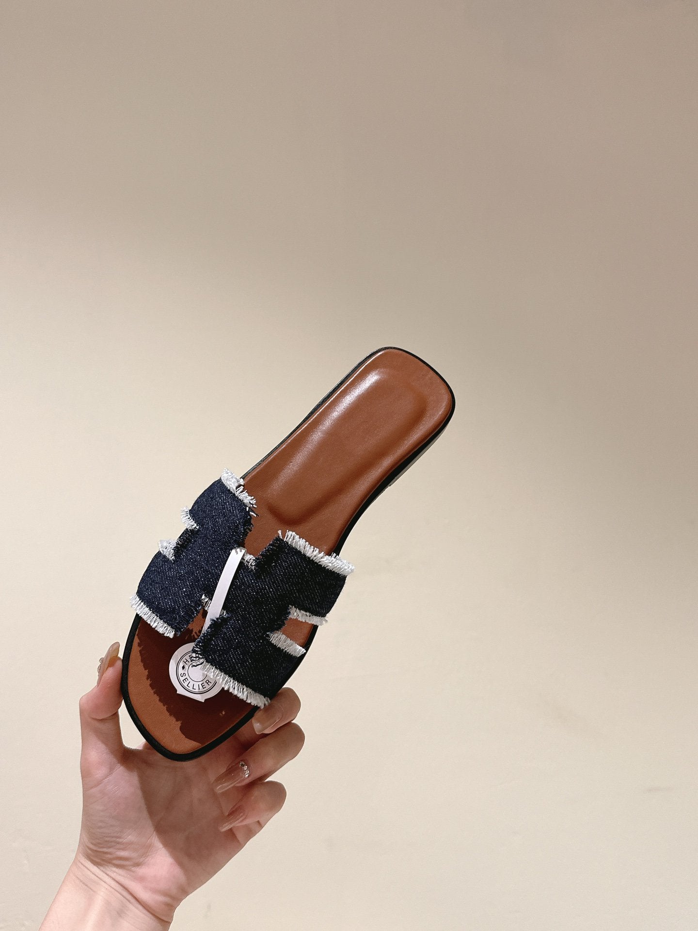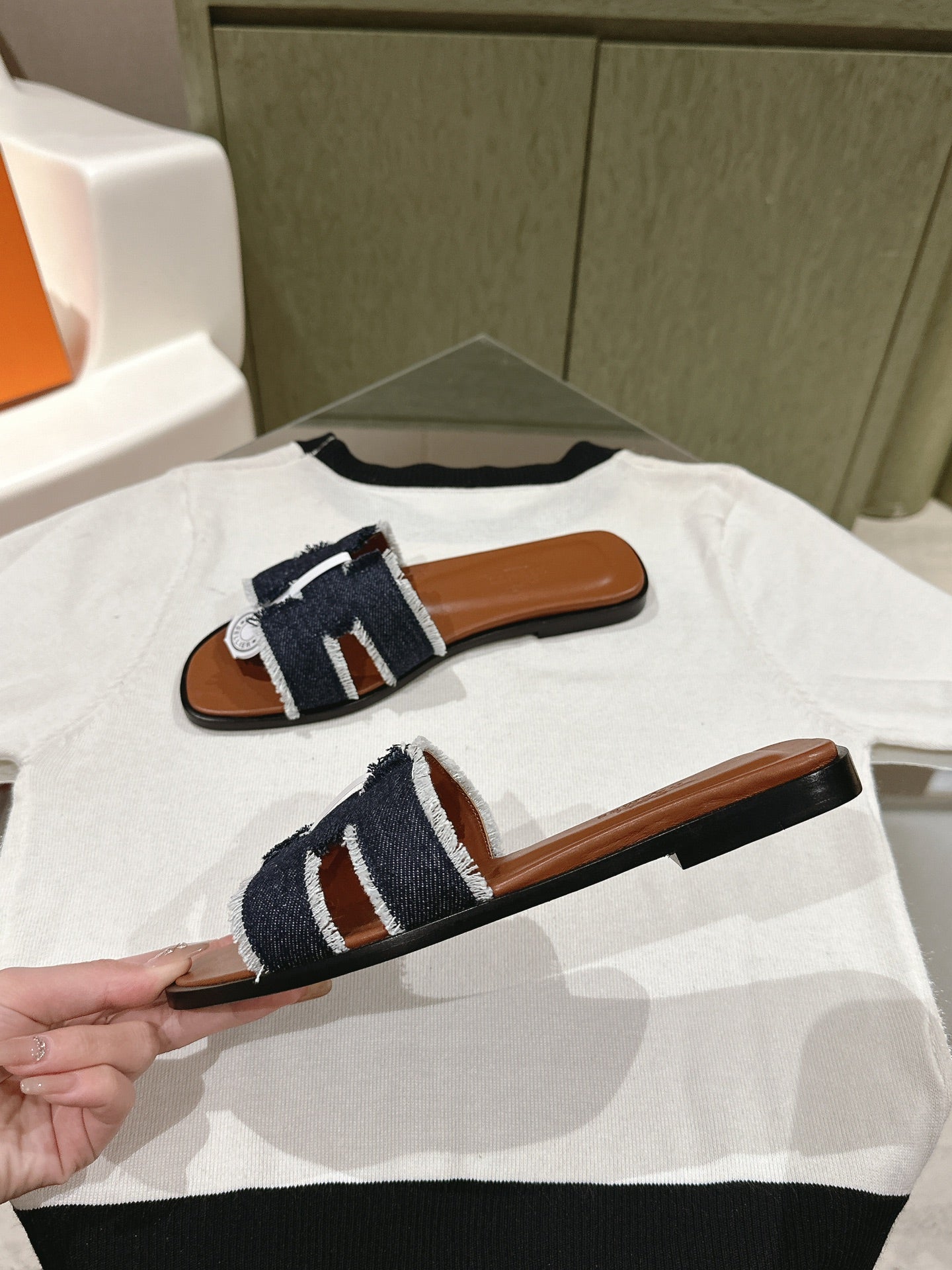 0ran sandal black denim brown calfskin