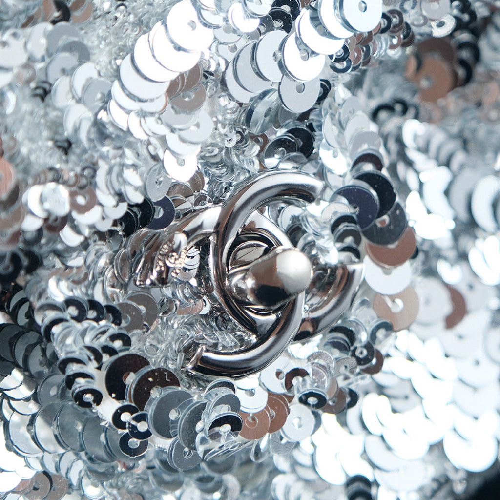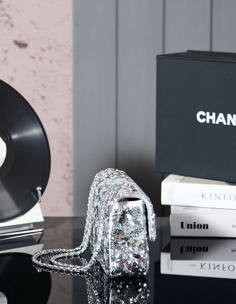 25C Flap Bag 21cm Dense Silver Sequin White Calfskin