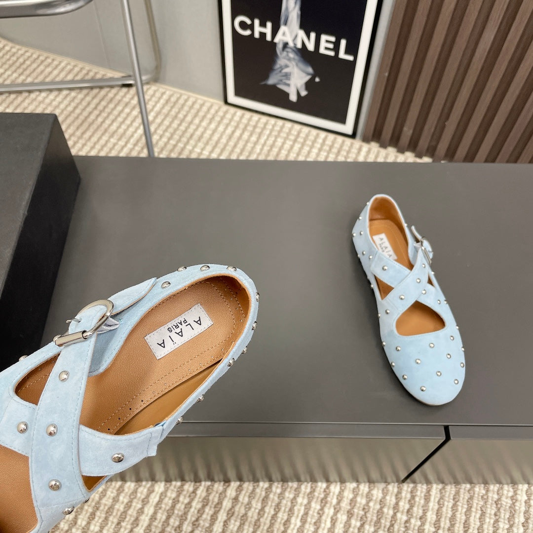 Alaia 2025 Criss Cross With Stud Ballet Flats Light Blue Suede 293212