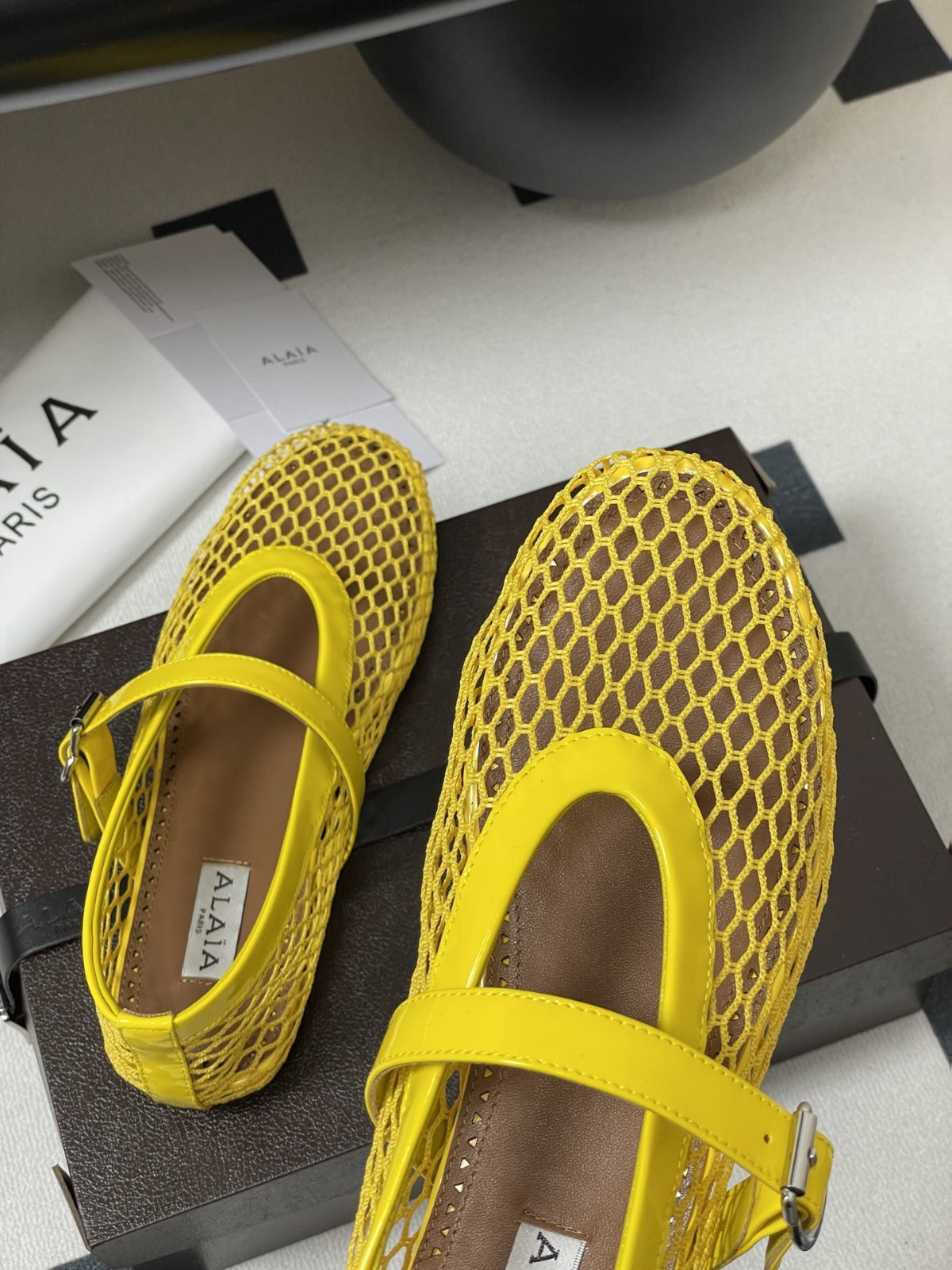 ALAIA BALLET FLATS IN YELLOW MESH FISHNET