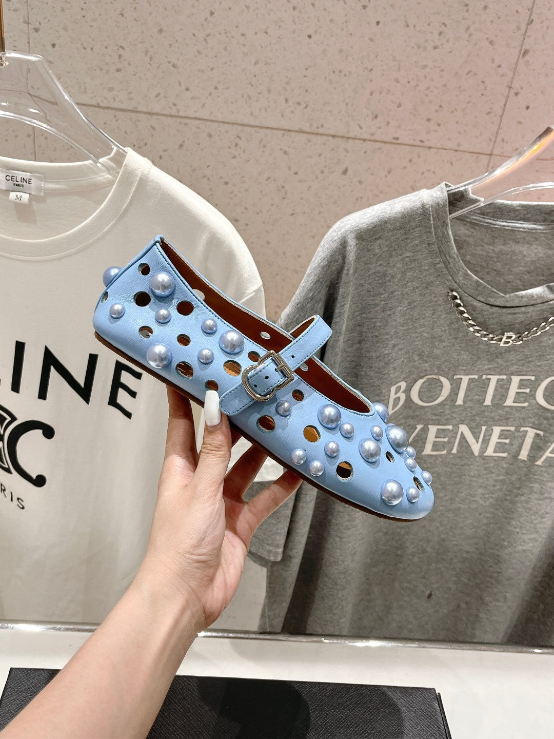 ALAIA PEARL MARY JANE SHOES IN LIGHT BLUE LAMBSKIN