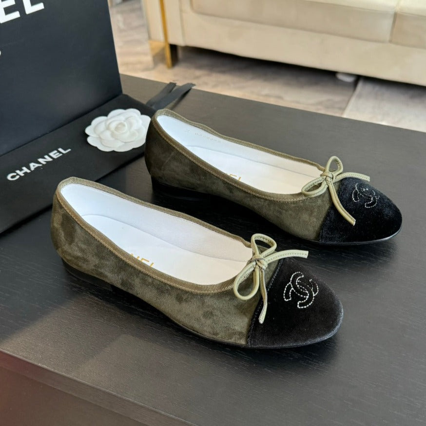 ballet flat moss green suede and black canvas