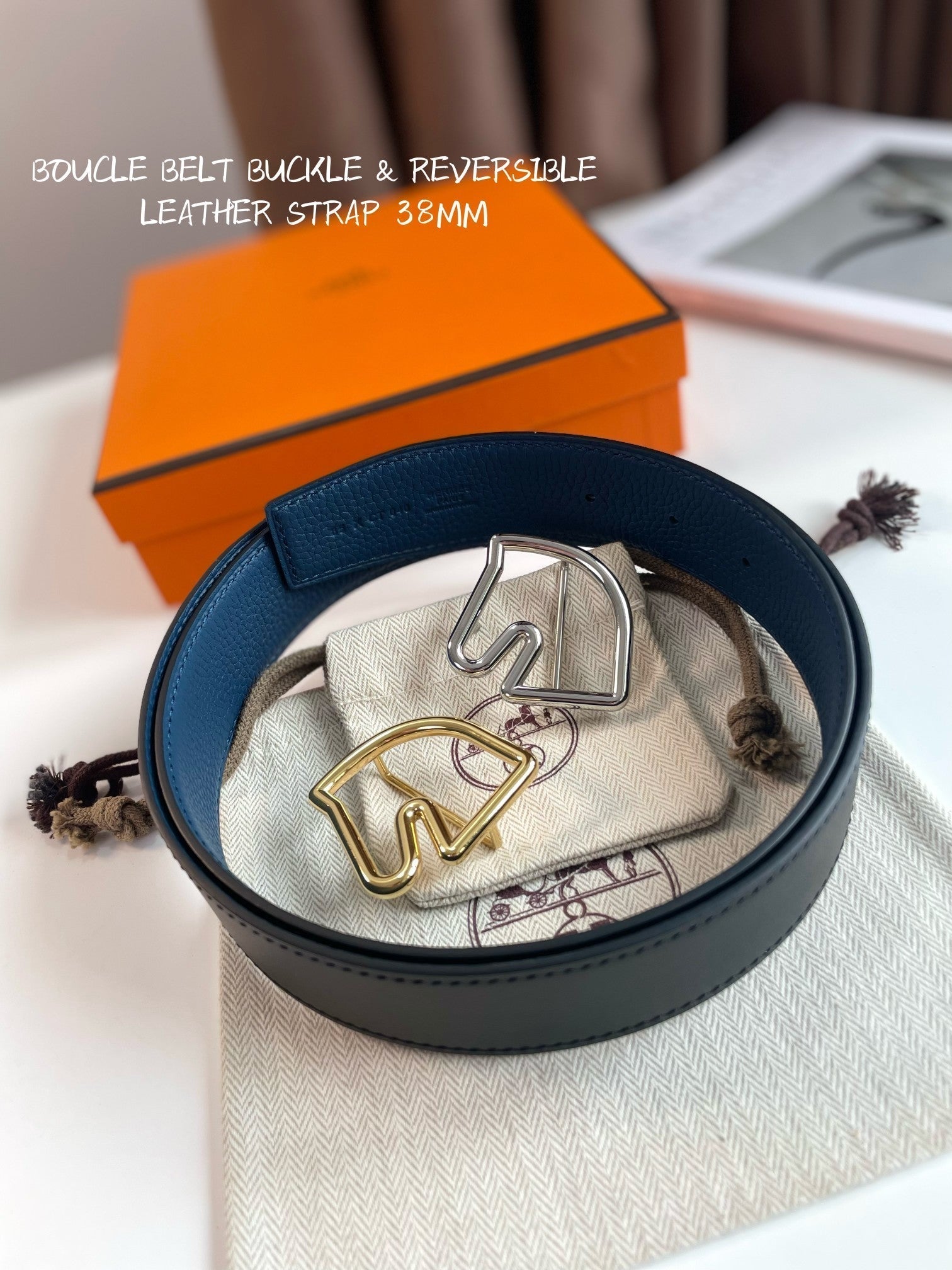 BOUCLE BELT BUCKLE & REVERSIBLE NAVY BLUE AND BLACK AND WHITE LEATHER STRAP 38MM GOLD HARDWARE