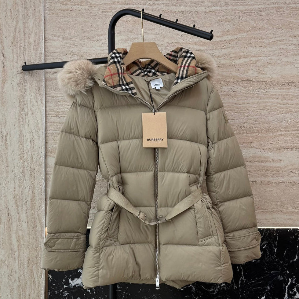 Burberry 25 Fur Collar Plaid Slim-fit Beige Jacket Polyester Down