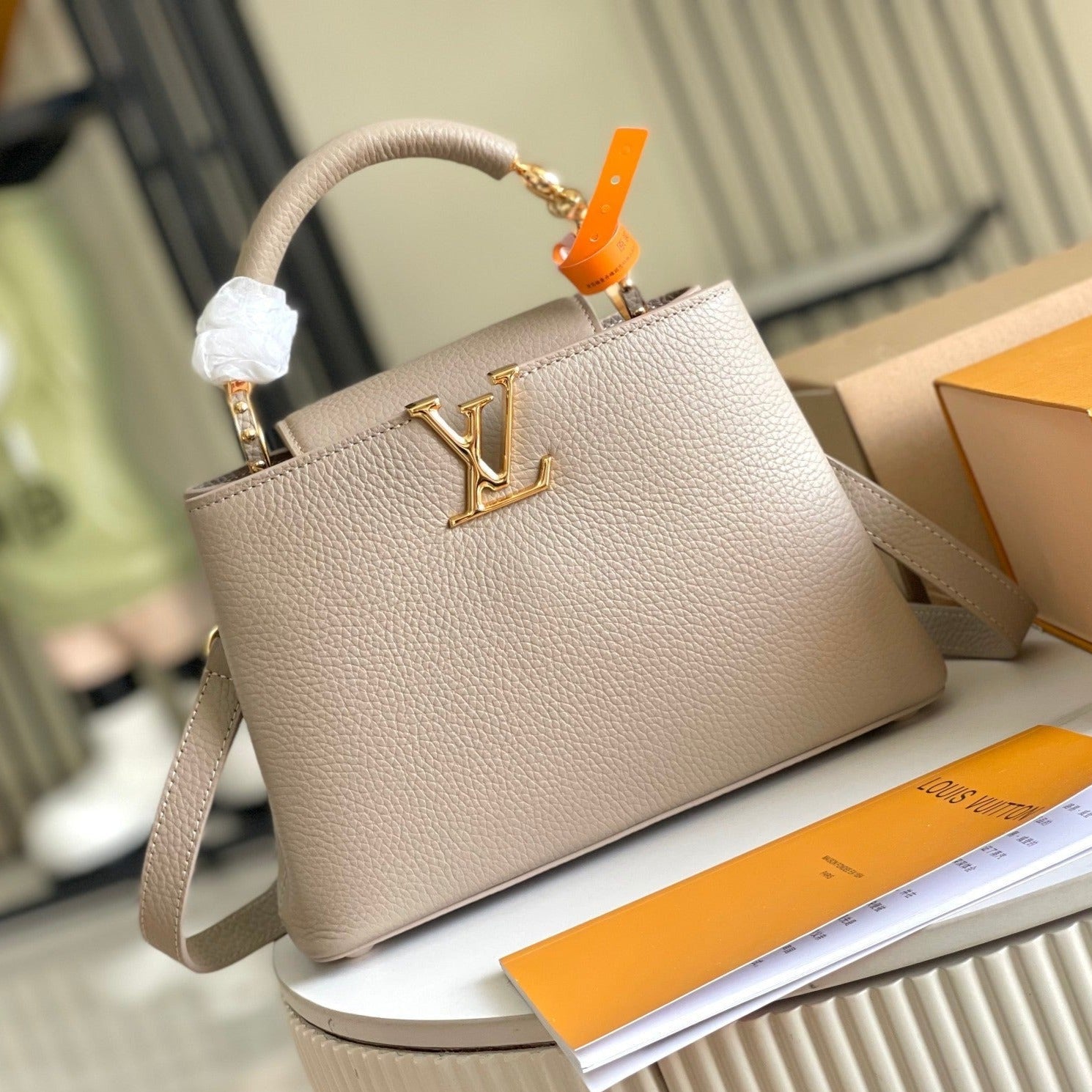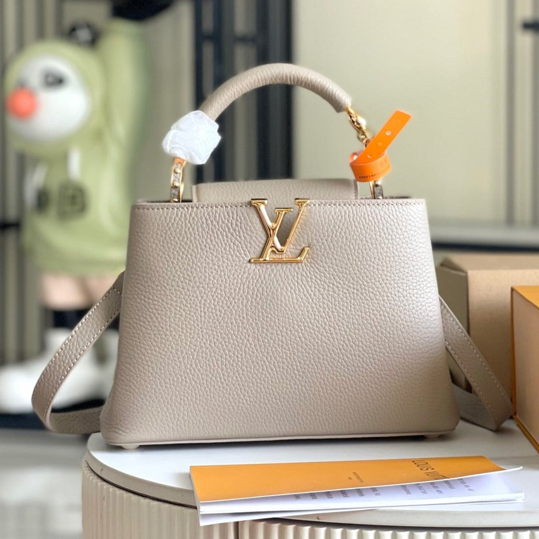 CAPUCINES BB 27 DARK BEIGE TAURILLON GOLD HARDWARE