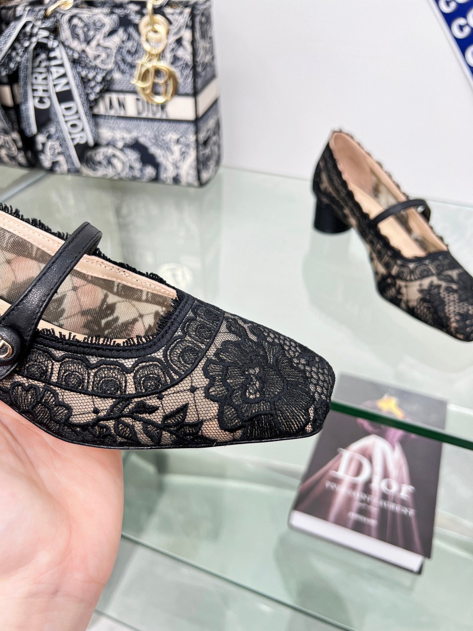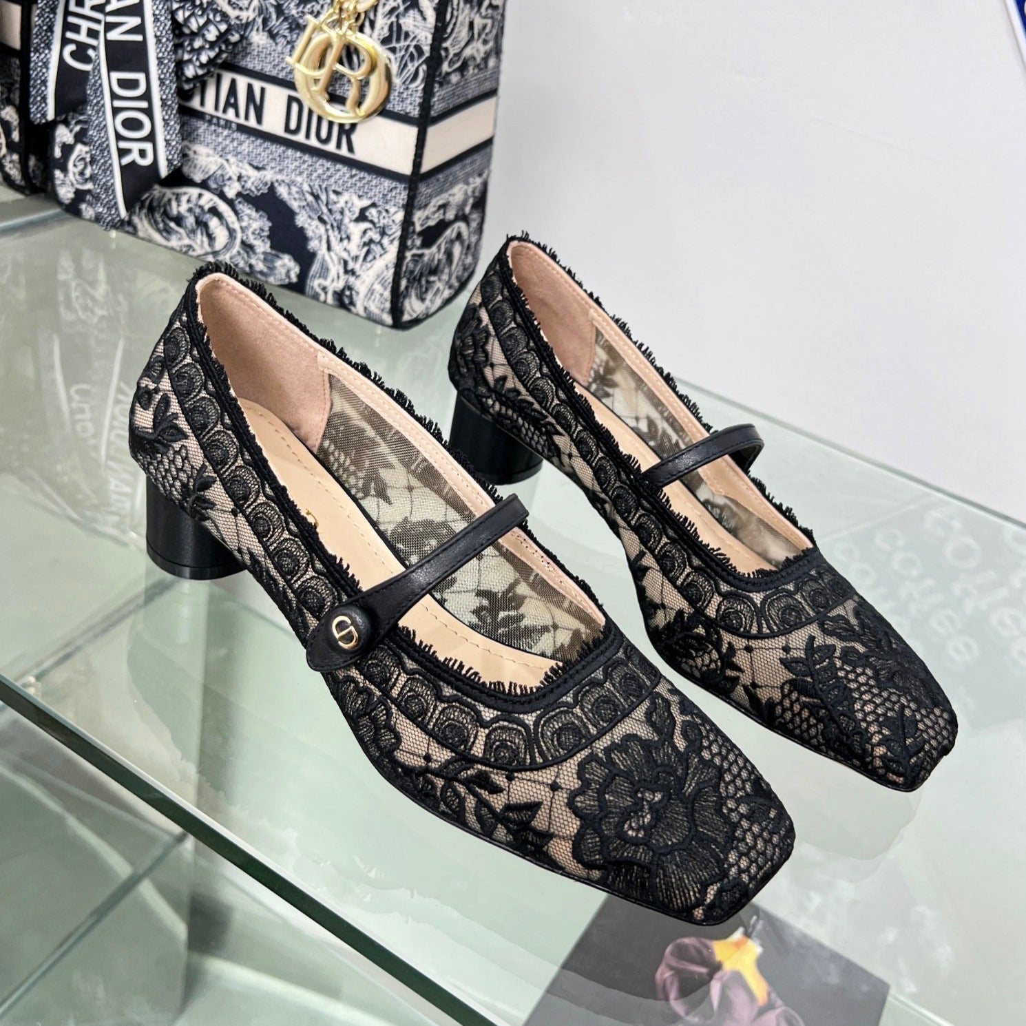 cd mary jane transparent mesh embroidered black flower motif