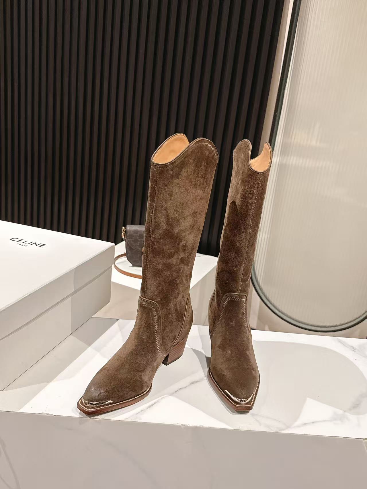 CELINE 25 Mid Calf Cowboy Boots Dark Brown Suede