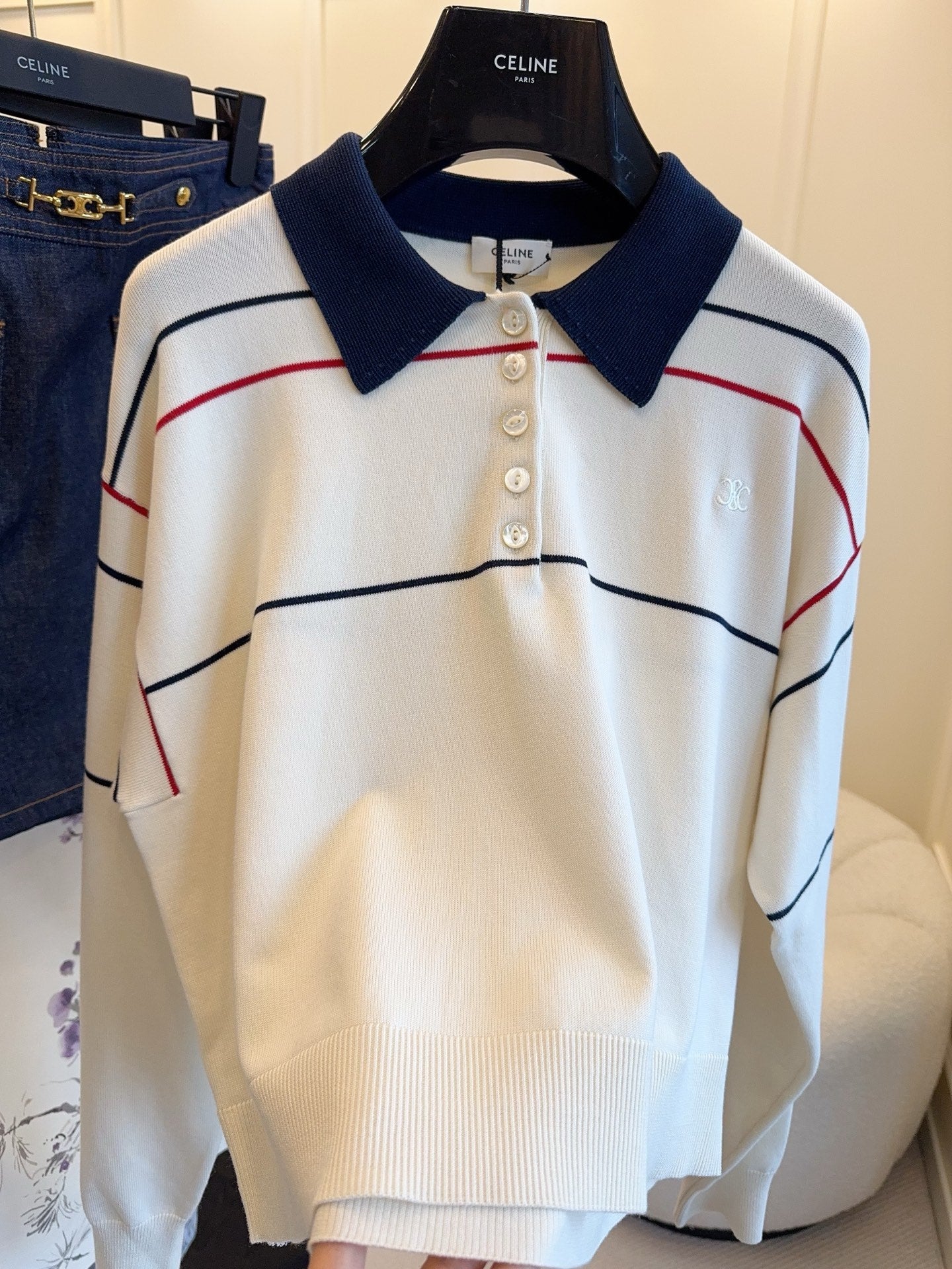 Celine 25 Polo Long Sleeves Shirt White Silk Cotton