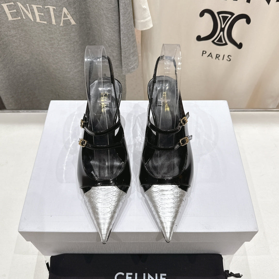 Celine 25C Judy Double Strap Mary Jane Slingback Black mix Silver Sheepskin 236776