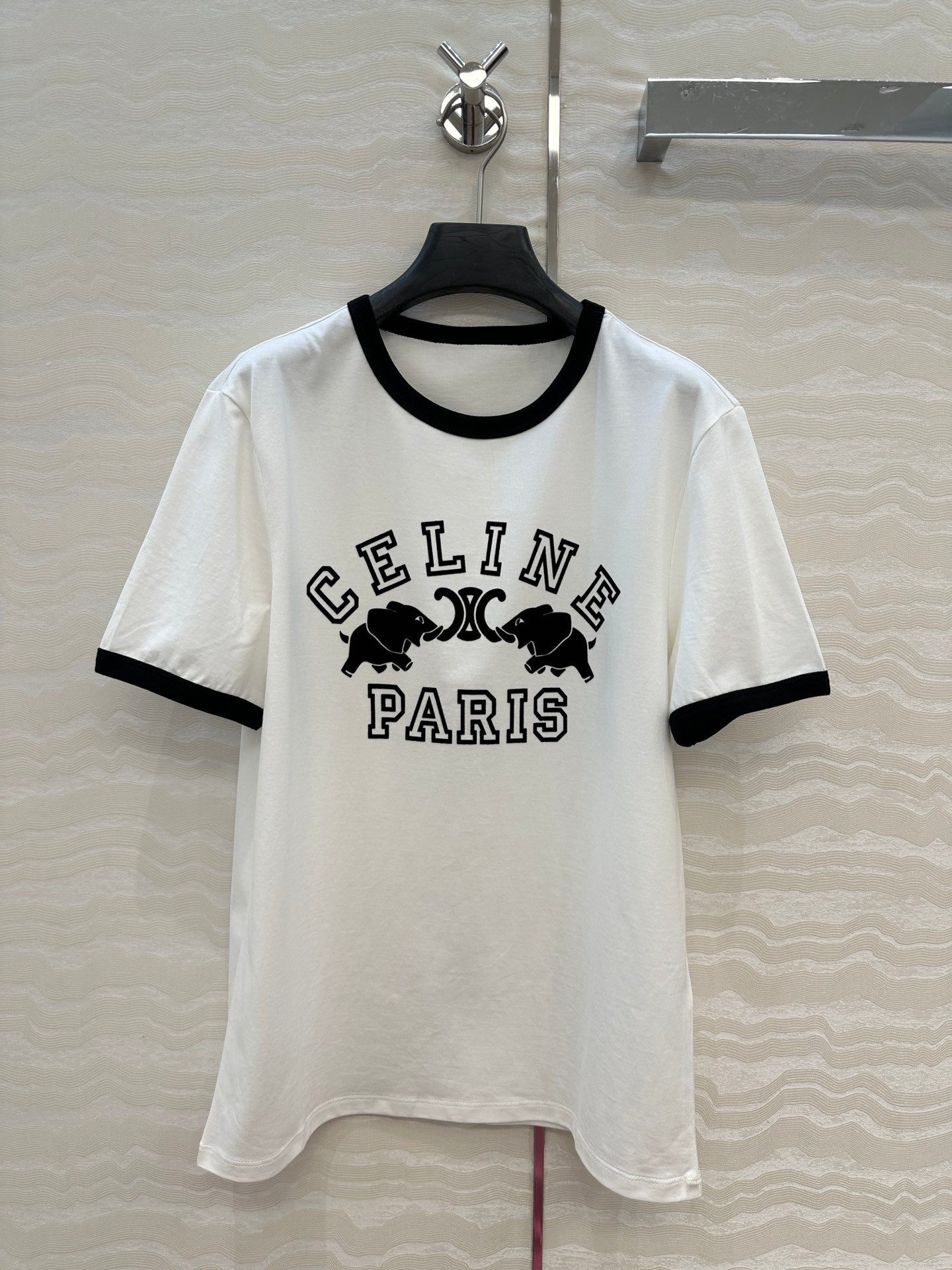 Celine Elephant Letter Flocking Short-sleeved T-shirt White mix Black Cotton