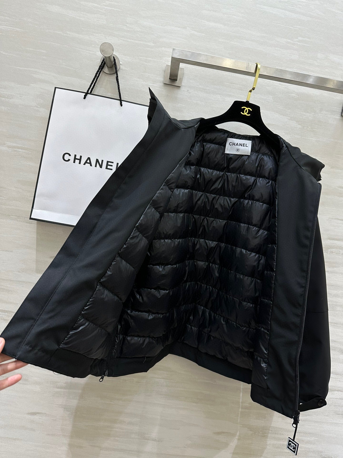Chanel 25 Hooded Windbreaker Jacket Black Down Cotton 312195