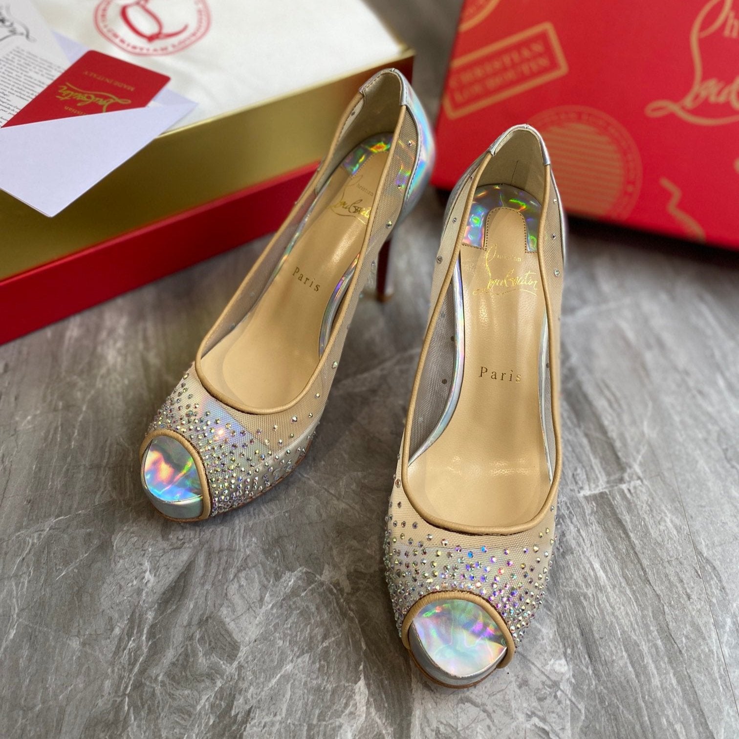 CL Very Strass Peep Toe Pumps 120mm Mesh and Leather Silver