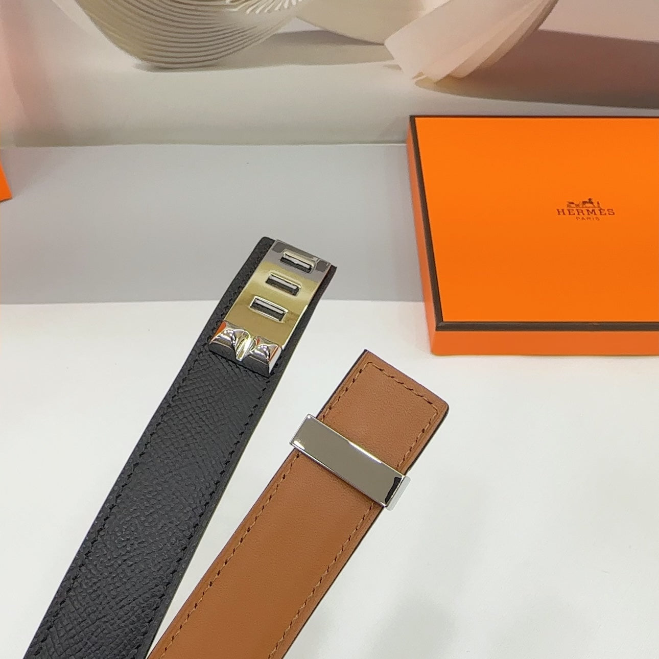 • H Buckle in permabrass plated metal.