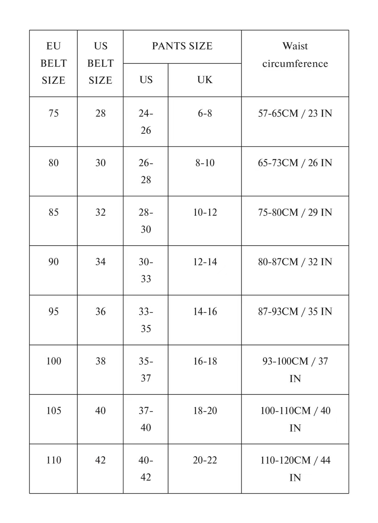 | EU BELT SIZE | US BELT SIZE | PANTS SIZE | Waist circumference | |