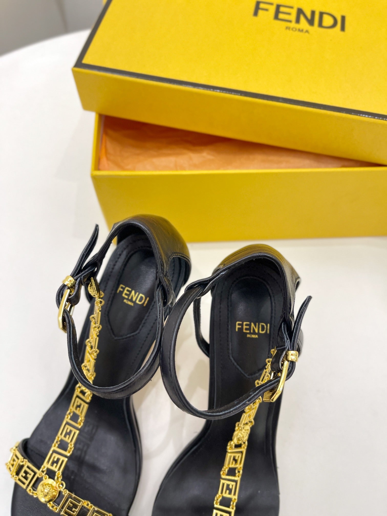 FENDI HIGH-HEELED 85 MM SANDALS IN BLACK LAMBSKIN WITH GOLD HARDWARE