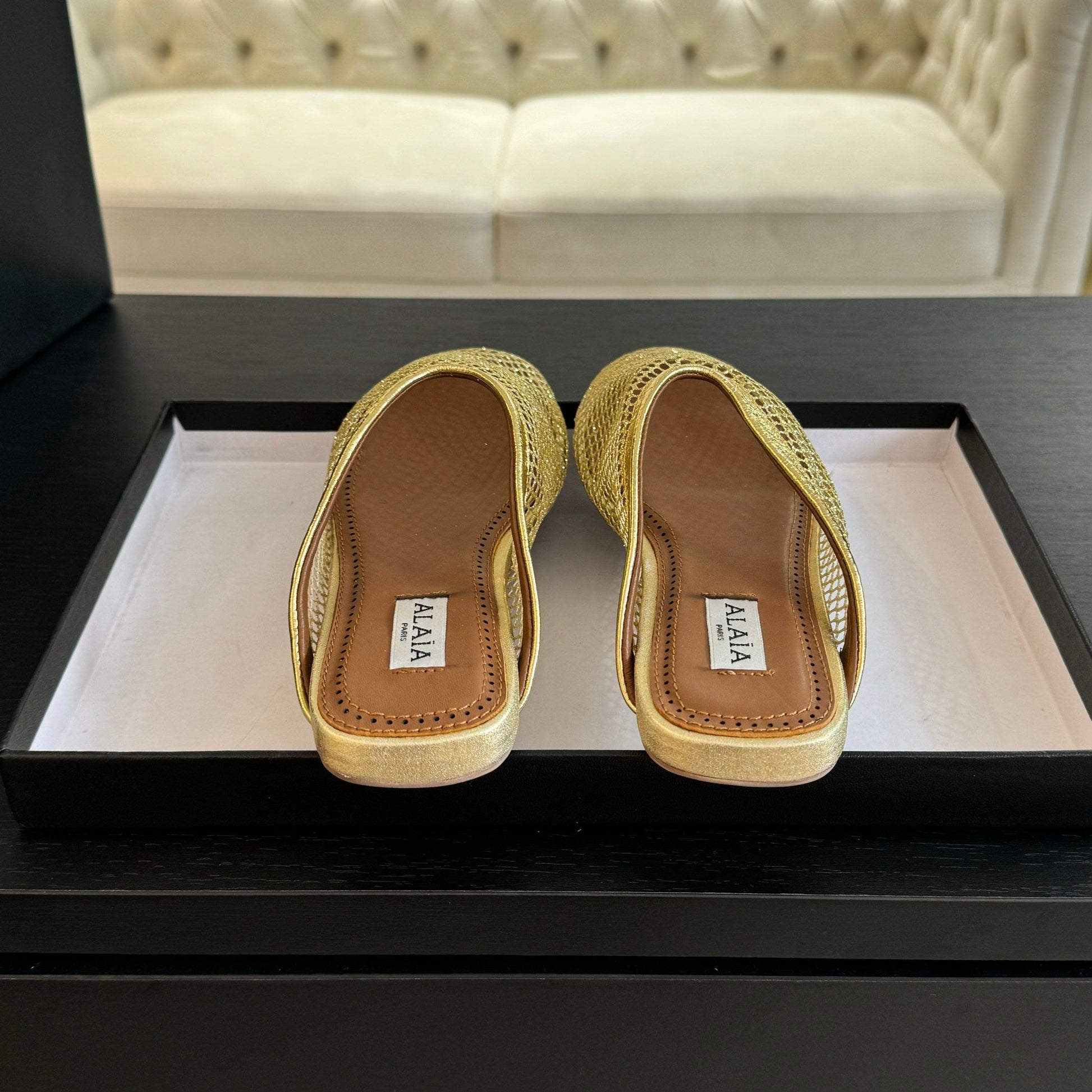 flat mule fishnet gold metalic lambskin