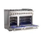 The 48" Forno Capriasca Dual Fuel Range brings professional styling and Performance into your home kitchen with its durable and beatiful 304 grade stainless-steel design. Cooking surface has 8 sealed dual-ring brass burners with a total output of 160,000 BTU. 20K dual-ring burner for boiling or searing and is able to perform simmering like melting chocolate or sauces, Continuous heavy-duty cast-iron grates allow for easily sliding pots or pans off heat when desired. The two ovens are 6.58 cu.ft. combined capacity and boasts a total output of 9,700 Watts, providing plenty of power for baking, roasting, and broiling. Impressive blue enamel interiors allowing for easy cleaning and 3-layer glass oven door window provides both heat retention and an unobstructed view. Right-side oven has a true convection fan function. Included are 6 fully telescopic easy access stainless steel oven racks, reversible grill/griddle, complete Rotisserie Kit including Skewer & Forks, concave Wok Ring and LP conversion kit. Additionally, zinc coated metal knobs with bezel rings will maintain their beauty for years. All FORNO products come with a 2 year warranty.