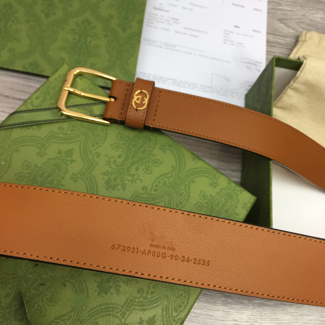 G BELT GOLD SQUARE INSTALL BUCKLE BROWN LEATHER 3.5CM