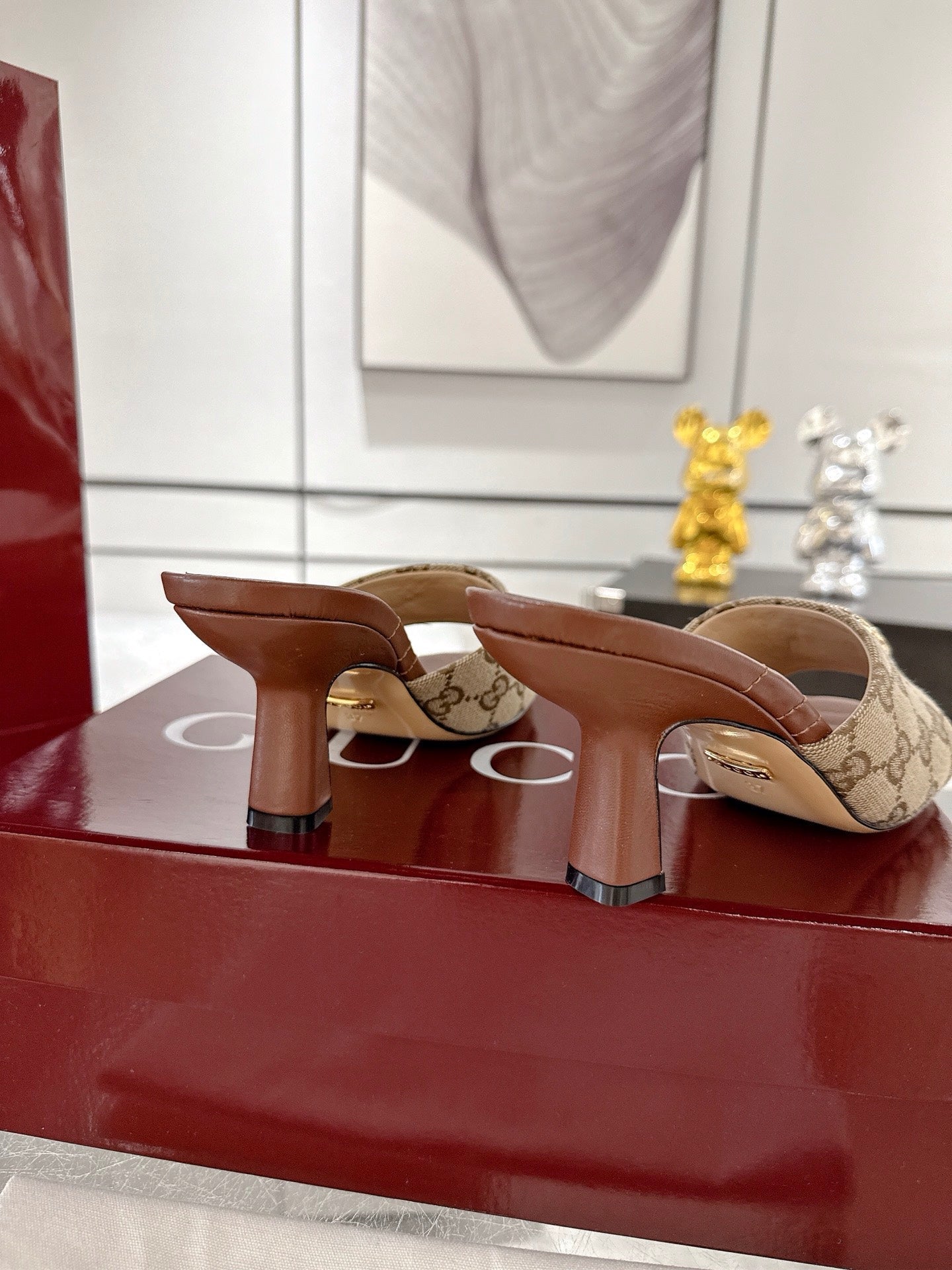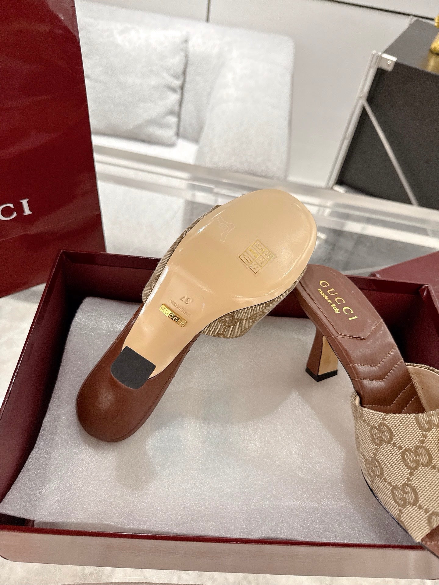 GC 2025 Double G High Heel Sandals Brown Canvas Sheepskin 292466